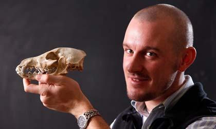 ซามูเอล เบลค์แนป อิลล์ นักวิจัย ถือกะโหลกศีรษะของสุนัขเลี้ยงรุ่นแรก ที่เขาพบพร้อมเศษกระดูก บริเวณถ้ำฮินด์ส แหล่งโบราณคดีหลักแห่งหนึ่งในเท็กซัสตะวันตกเฉียงใต้ ใกล้กับเขตแดนเม็กซิโก นักวิจัยบอกว่าน่าจะเป็นสุนัขเลี้ยงที่เก่าแก่ที่สุดที่รู้จักมาในอเมริกาเหนือ โดยเมื่อทดสอบด้วยการกำหนดอายุคาร์บอน พบว่ากระดูกมีอายุ 9,400 ปี ในภาพนักวิจัยโพสท่าถ่ายภาพที่มหาวิทยาลัยเมนในเมืองโอโรโน สหรัฐฯ.