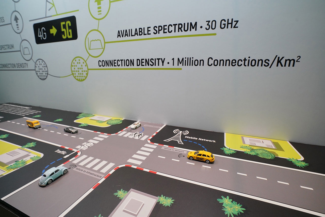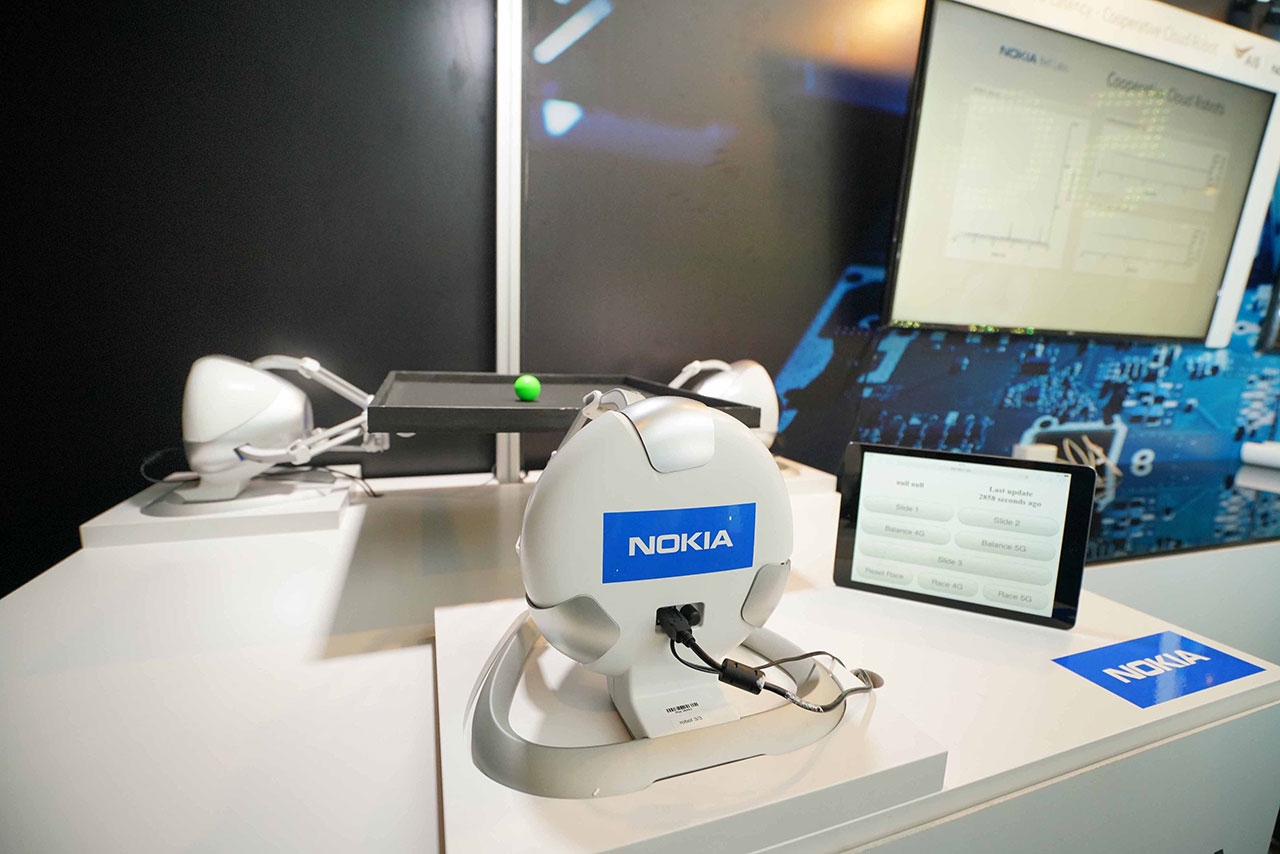 การสาธิตประสิทธิภาพการตอบสนองที่รวดเร็วของเครือข่าย 5G โดยการใช้หุ่นยนต์สามตัวในการหาจุดสมดุล ที่ทำให้ลูกบอลอยู่กึ่งกลางกระดาน การสาธิตแสดงเวลาที่หุ่นยนต์ใช้ในการหาจุดสมดุลผ่านการสื่อสารระหว่างกันโดยใช้เครือข่าย 4G เปรียบเทียบกับเครือข่าย 5G ซึ่งทำให้ประสิทธิภาพด้านความเร็วที่แตกต่างกันอย่างชัดเจน