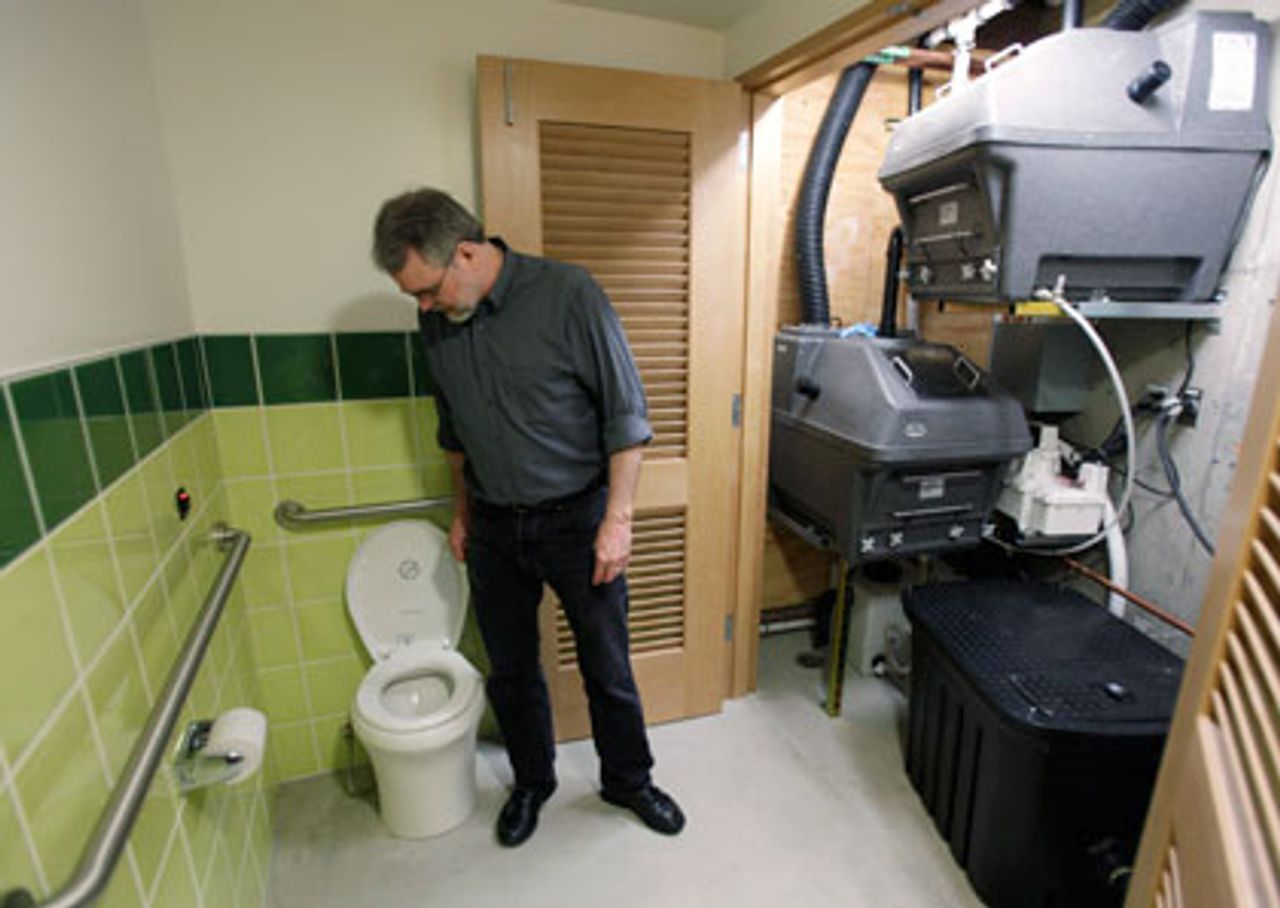 สแตน ริชาร์ดสัน ผู้อำนวยการฝ่ายเทคโนโลยีและวางแผนวิทยาเขต ที่โรงเรียนเบอร์ทสไช ในซีแอตเติล มองดูส้วมปุ๋ย ภายในอาคารวิทยาศาสตร์แห่งใหม่ในโรงเรียน ซึ่งเป็นหนึ่งในบรรดาอาคารอีกนับร้อยหลังในสหรัฐ อเมริกาที่มีระบบจัดการและรีไซเคิลน้ำฝนและน้ำเสีย.