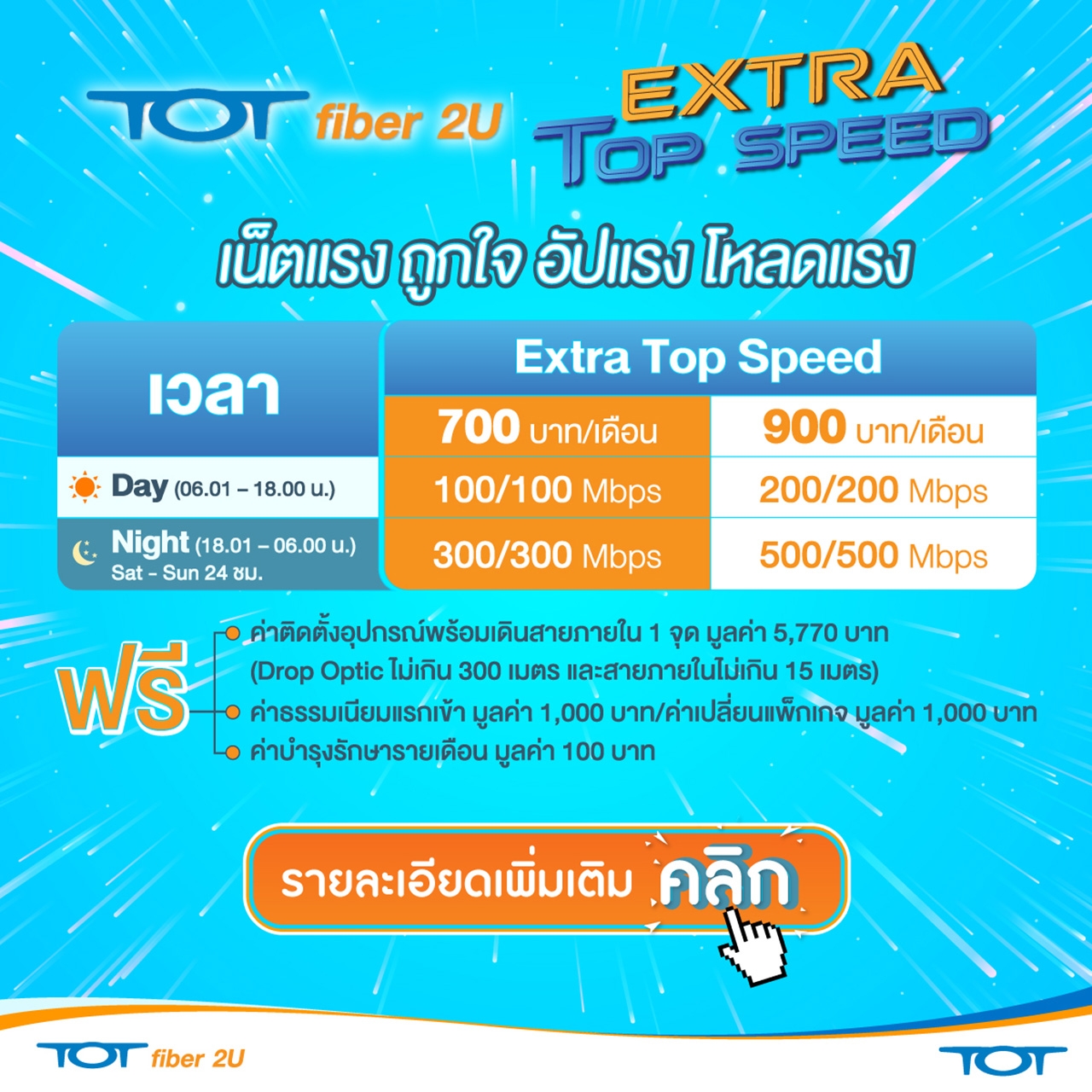สมัคร TOT fiber 2U โปร EXTRA TOP SPEED วันนี้ฟรี ค่าติดตั้งอุปกรณ์พร้อมเดินสายภายใน 1 จุด