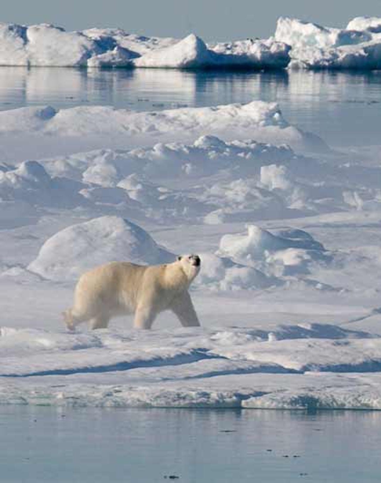 ภาพจากแฟ้มเมื่อกรกฎาคม 2551 ขณะที่หมีขั้วโลกเดินไปตามแผ่นน้ำแข็งที่ลอยในอ่าวแบฟฟิน มุมมองจากหน่วยยามฝั่งแคนาดา ทีมศึกษานานาชาติพบว่า การปล่อยสารปรอทในระดับโลกจะเพิ่มขึ้น 25 เปอร์เซ็นต์ในปี 2020 (พ.ศ.2563) หากไม่มีการควบคุมใดๆ และนั่นจะเป็นภัยคุกคามต่อหมีขั้วโลก วาฬ และแมวน้ำ รวมถึงชุมชนแถวขั้วโลกเหนือที่ล่าสัตว์เหล่านั้นเป็นอาหาร.
