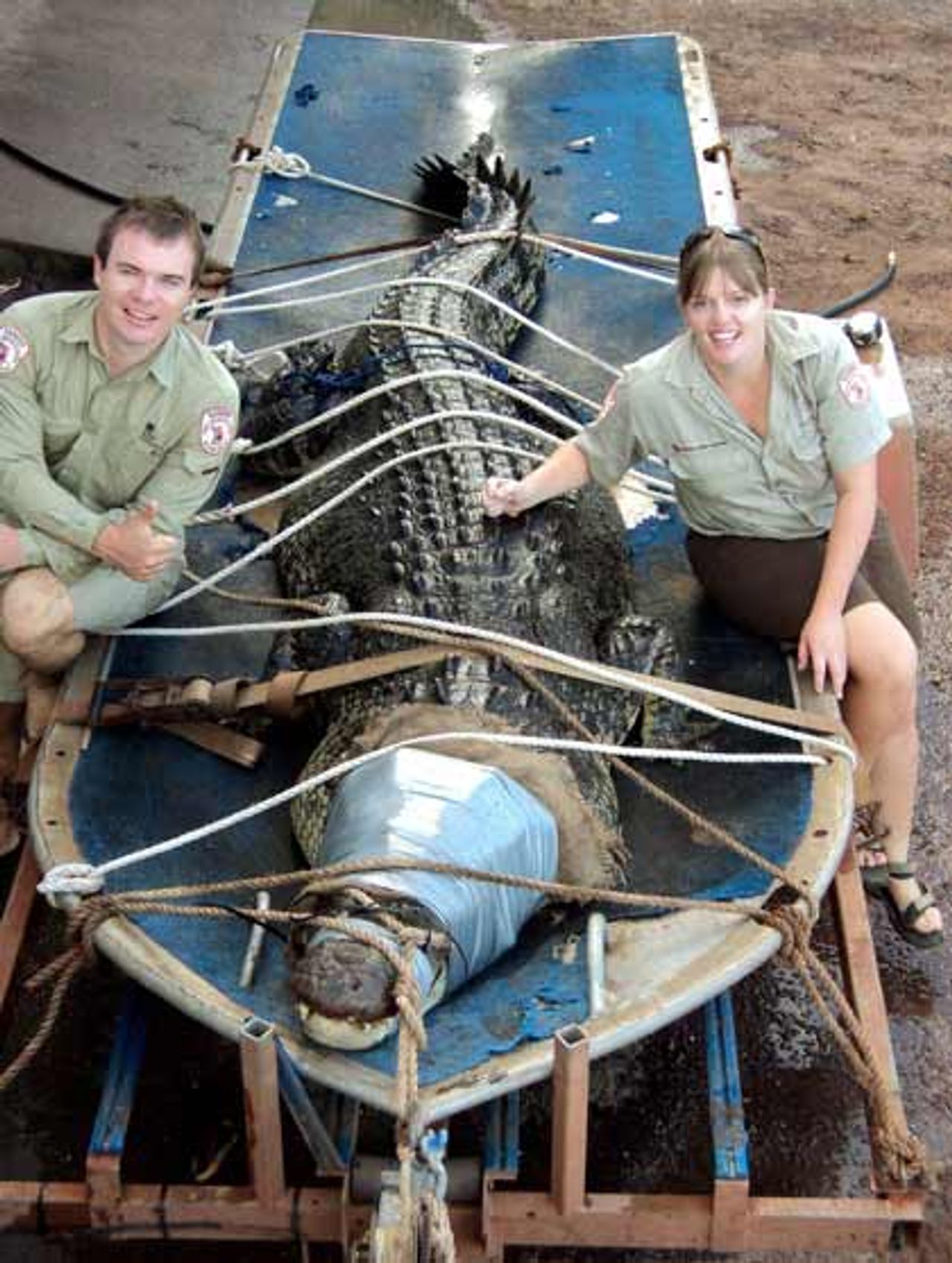 เจ้าหน้าที่อนุรักษ์ของกรมอุทยานและสัตว์ป่าแห่งนอร์ทเทิร์น เทอร์ริทอรี่ แสดงผลงานการไล่จับจระเข้น้ำเค็มตัวใหญ่อย่างกับปิศาจ ขนาด 4.64 เมตร จับได้บริเวณลำธารดองกี้ ใกล้เมืองแคทเธอรีน เจ้าหน้าที่ของออสเตรเลียต้องใช้รถโฟร์วีลขับลากจระเข้น้ำหนัก 600 กก. ไปยังฟาร์มจระเข้ใกล้เคียง อันจะใช้เป็นที่โชว์ตัวมันด้วย.