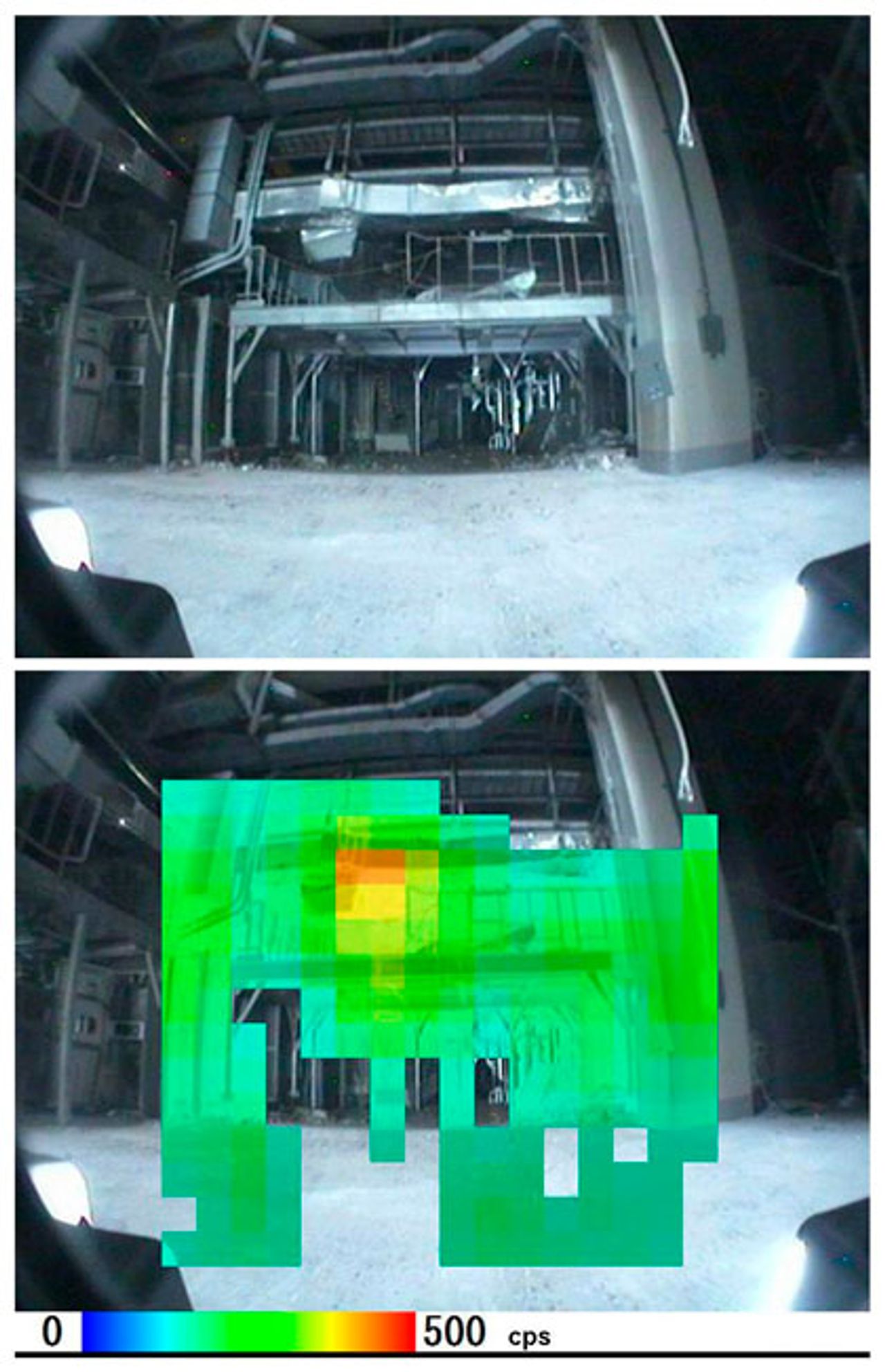 ภาพถ่ายเปรียบเทียบระหว่างภาพบนจากกล้องถ่ายภาพธรรมดา และภาพล่างจากกล้องถ่ายภาพรังสีแกมมา แสดงสภาพภายในโรงไฟฟ้า นิวเคลียร์ฟูกูชิมะ ไดอิจิ ด้านใต้ที่มีประตูล็อกอากาศสองชั้น สำหรับกล้อง ถ่ายภาพรังสีแกมมาใช้วัดระดับรังสีแกมมาในบริเวณโรงไฟฟ้านิวเคลียร์ พบว่ามีอยู่เป็นจำนวนมาก ในบริเวณโรงไฟฟ้าดังกล่าวหลังเหตุการณ์แผ่นดินไหวและสึนามิที่ญี่ปุ่น เมื่อ 11 มี.ค.