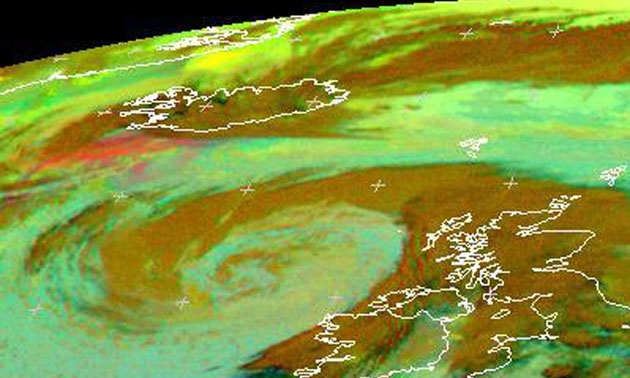 ดาวเทียมยูเมตแสตจับภาพควันขี้เถ้าที่ฟุ้ง กระจายขึ้นไปเหนือท้องฟ้าประเทศไอซ์แลนด์ ผู้เชี่ยวชาญด้านความปลอดภัยเตือนว่าขี้เถ้าจากภูเขาไฟ ในไอซ์แลนด์จะทำให้ปิดทางเดินอากาศของประเทศ และอาจพัดกระจายเป็นวงกว้างทั่วยุโรปตะวันตก เป็นที่หวั่นเกรงว่าอาจก่อให้เกิดความโกลาหลครั้งใหม่ด้านการ บิน เจ้าหน้าที่ความปลอดภัยด้านการบินแจ้งว่า ขี้เถ้าจากภูเขาไฟกริมส์โวตน์อาจจะขึ้นไปทางเหนือของสกอต แลนด์ในวันอังคาร ก่อนจะลงสู่อังกฤษ ฝรั่งเศส และสเปนในอีกสองวันถัดมา.