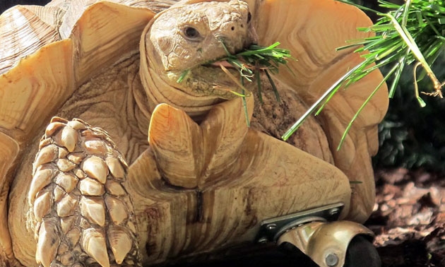 เต่าแอฟริกันขยับตัวไปตามบาทวิถีนอกโรงพยาบาลสอนสัตวแพทย์ มหาวิทยาลัยวอชิงตันสเตท โดยใช้อวัยวะเทียมที่ไม่ได้ไฮเทคอะไรเลย จากห้องทดลองอวัยวะเทียมของที่นั่น อุปกรณ์ทำอวัยวะเทียมมาจากร้านเอซฮาร์ดแวร์ เป็นเพียงลูกล้อเลื่อนราคา ประมาณ 210 บาท เอามาติดแทนขาหน้าที่พิการ ที่เมืองพูลแมน วอชิงตัน สหรัฐอเมริกา.