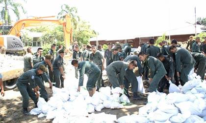 ทางป้องกันที่ง่ายที่สุดก็คือ เราหากระสอบทรายมาวางไว้อีกด้านหนึ่งของรั้วบ้านเรา (ในบ้านเรา) วางไว้ติดชิดกับรั้วไปเลย ยามเมื่อรั้วจะเอียงเพราะว่าน้ำที่ท่วมกดน้ำหนักมาอีกด้านหนึ่ง กระสอบทรายก็จะทำหน้าที่ช่วยรับน้ำหนักเอาไว้ ถ่ายแรงจากรั้วมา รั้วก็ยังตั้งตรงอยู่ได้ "กำแพงเมืองของเราก็ไม่แตก หรือล้มครืนลงมาครับผม"