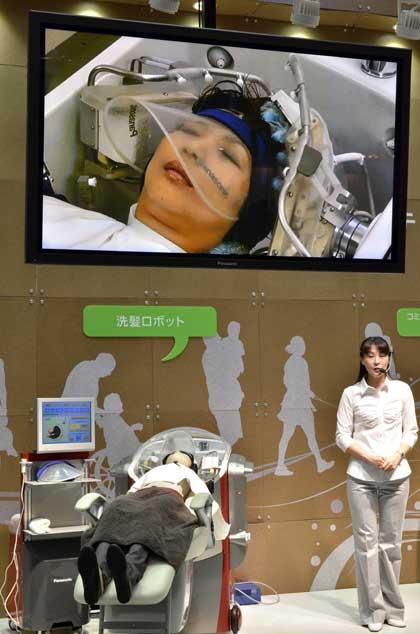 บริษัทผู้ผลิตเครื่องใช้ไฟฟ้าของญี่ปุ่น “พานาโซนิค” นำโมเดลหุ่นยนต์สระผมเครื่องใหม่มาจัดแสดง โดนหุ่นยนต์นี้มี 24 นิ้ว เอาไว้สำหรับนวดหนังศีรษะ มีแขนฉีดพ่นน้ำกับแชมพู นอกจากสระนวดแล้ว หุ่นยนต์ยังเป่าผมให้แห้งด้วย ที่งานนิทรรศการโฮมแคร์แอนด์รีแฮบิลิเทชั่น กรุงโตเกียว ประเทศญี่ปุ่น.