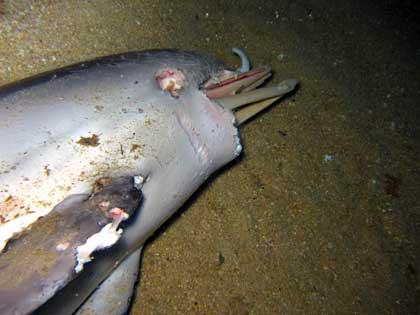 หนึ่งในโลมาสามตัวที่พบนอนตายโดยมีเชือกผูกติดอยู่กับแท่งคอนกรีต ลึกลงไป 58 เมตร ในบริเวณชายฝั่งทะเลเมดิเตอเรเนียน เมืองมาร์ก เซย ภาคใต้ของฝรั่งเศส นักดำน้ำต้องนำร่างของโลมาขึ้นมาจากน้ำ ก่อนที่จะนำไปตัดชิ้นเนื้อเพื่อตรวจพิสูจน์ต่อไป.
