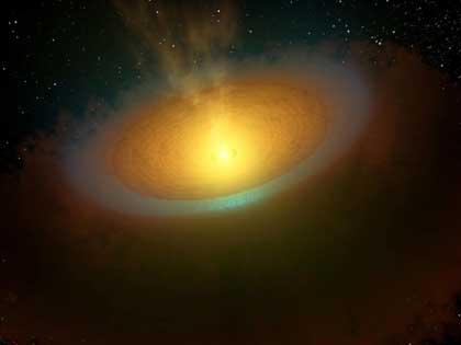 ภาพวาดแสดงลักษณะการเกิดวงแหวนน้ำแข็งล้อมรอบดาวรุ่นเยาว์ที่ชื่อ “ทีดับบลิว ไฮแดร” อยู่ในตำแหน่งประมาณ 175 ล้านปีแสงในไฮดรา หรือกลุ่มดาวซีเซอร์เพนท์ นักดาราศาสตร์ใช้หอสังเกตการณ์อวกาศเฮอร์เชลตรวจจับพบปริมาณน้ำเย็นจำนวนมากที่ระเหยขึ้นมา ซึ่งอาจจะมาจากเกล็ดน้ำแข็งในวงแหวน ในตำแหน่งที่เย็นมากบริเวณนอกระบบดาว.