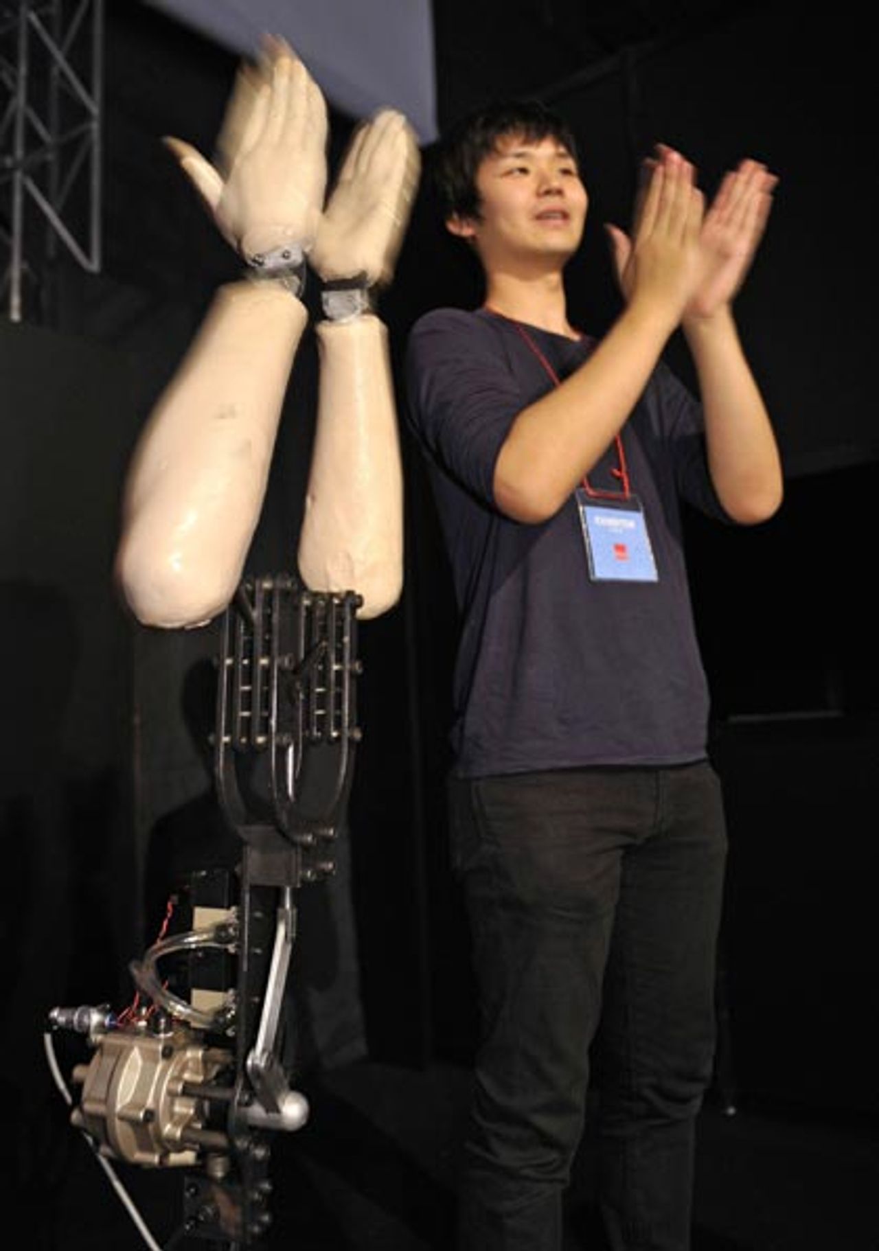 มาซาโตะ ทาคาฮาชิ นักวิจัยมหาวิทยาลัยเคโอ สาธิตการทำงานของหุ่นยนต์ “ออนซู” ซึ่งเป็นหุ่นยนต์ตบมือทำจากอะลูมิเนียม และผิวหนังยูรีเทนเรซิน ใช้พลังแรงลมอัด ตบมือให้เข้าจังหวะดนตรี ในระหว่างการเปิดงานดิจิตอล คอนเทนต์ เอ็กซ์โป กรุงโตเกียว ประเทศญี่ปุ่น.