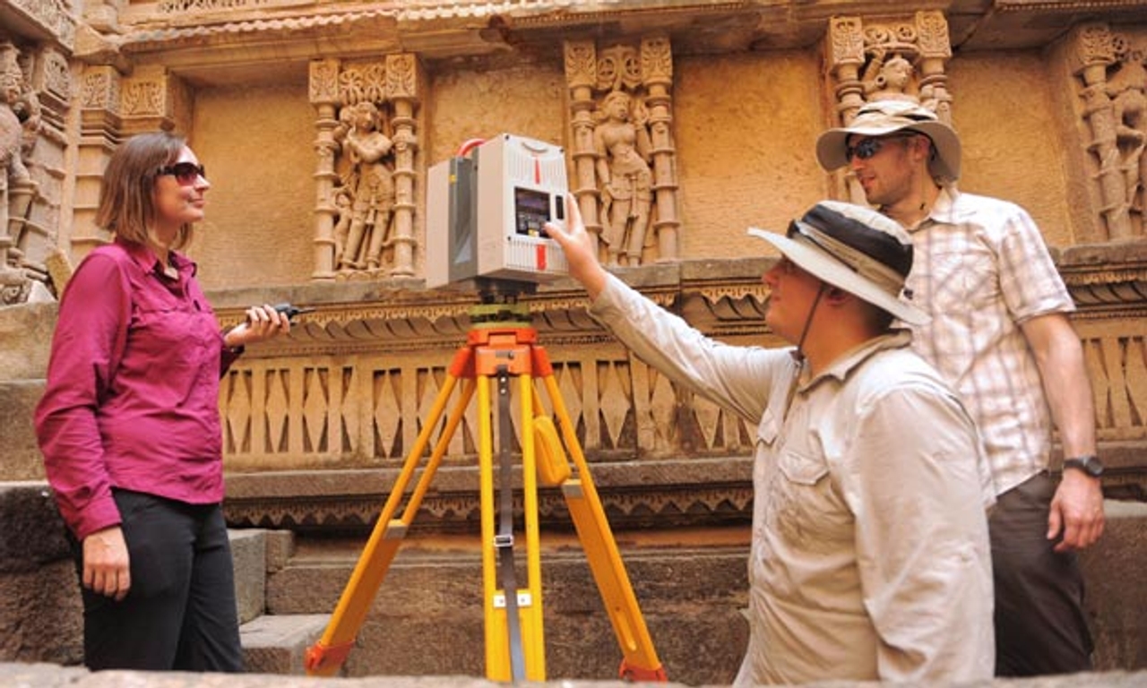 ลิน วิลสัน (ซ้าย) ผู้จัดการโครงการสกอตติช เท็น ทำงานร่วมกับทีมงานระหว่างกระบวนการถ่ายภาพดิจิตอลสามมิติในโบราณสถาน รานิ คิ วาฟ สเตปเวล ในปาทาน ห่างจากอาห์เมดาบัดราว 120 กม. ทีมนี้จะเก็บบันทึกภาพรูปสลักและภาพตามระเบียงของสถานที่ดังกล่าว ซึ่งขณะนี้กำลังอยู่ระหว่างยื่นขอเป็นมรดกโลกจากองค์การยูเนสโก.