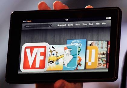 ภาพจากแฟ้มเมื่อช่วงปลายเดือนกันยายนที่ผ่านมา ซึ่งเป็นการแถลงข่าว “คินเดิล ไฟร์” ที่นิวยอร์ก สหรัฐอเมริกา “คินเดิล ไฟร์” เป็นแท็บเล็ตคอมพิวเตอร์ หน้าจอสีรุ่นแรกของอะเมซอน ที่ ลงสู้ศึกในสมรภูมิแท็บเล็ตระหว่างไอแพด ของค่ายแอปเปิ้ล และนุค คัลเลอร์ของค่ายโนเบิล อิงค์ เพิ่งมีการจัดส่งให้ลูกค้าไปเมื่อ 14 พ.ย.ที่ผ่านมา.