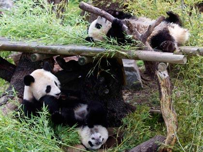 แพนด้าแฝด โปกับตีตี้ (บน) พักผ่อนนอนเล่นอยู่ข้างๆ ฮัว ซุยปา แม่ของทั้งสอง ภายในสวนสัตว์และพิพิธภัณฑ์สัตว์น้ำมาดริด ลูกแพนด้าแฝดคู่นี้เกิดเมื่อ 7 กันยายน 2553 ด้วยวิธี การผสมเทียม อันเกิดจากความพยายาม ร่วมกันของสภาวิจัยแห่งชาติสเปน กับนักวิทยาศาสตร์จากจีน ทั้งคู่จึงเป็นแพนด้าคู่แรกที่เกิดในสเปนนับแต่ปี 2525 เป็นต้นมา และเพิ่งได้กลับมาอยู่พร้อมหน้ากับแม่ของตนเป็นครั้งแรกเมื่อ 11 พ.ย.นับตั้งแต่เกิดมา.