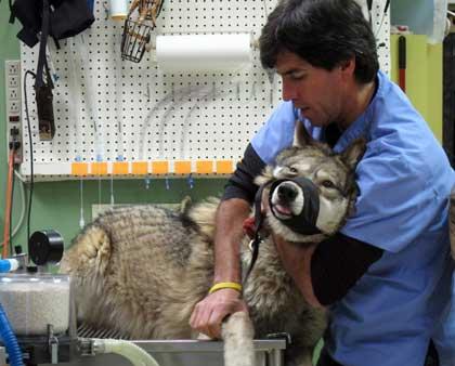 ดร.ลูอิส ลิซาร์รากา จากศูนย์วิจัยสัตว์ล็อกวูดในแคลิฟอร์เนีย อุ้มสุนัขป่าลูกผสมเพศเมีย ก่อนนำไปตอนที่อลาสกา เอสพีซีเอ ในเมืองแอน-ชอเรจ เจ้าหน้าที่รัฐได้ จับสัตว์ลูกผสม 29 ตัวขนส่งไปยังเขตรักษาพันธุ์สัตว์ล็อกวูด ทางตอน เหนือของลอสแอนเจลิส สหรัฐอเมริกา.