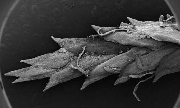 ภาพขยายของพืชโบราณชนิดหนึ่ง ชื่อว่า ไซบูดู ไซเพรัส เอสพี. สไปค์เลท (Sibudu Cyperus sp.Spikelet) อายุประมาณ 73,000 ปี นักวิจัยพบว่าคนยุคก่อนประวัติศาสตร์ที่อาศัยอยู่ในดินแดนแอฟริกาใต้ในปัจจุบัน ได้ใช้พืชชนิดนี้ที่มีคุณสมบัติทางยา และนำมาทำเป็นเครื่องนอนและเสื่อ โดยใบของมันสามารถไล่แมลงได้ด้วย.