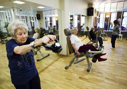 มาร์กาเรตา นอร์ดิน (ซ้าย) วัย 92 ปี พร้อมเพื่อนร่วมวัยเฉียดร้อยอีกหลายรายเข้าเรียนออกกำลังในกลุ่มผู้รับบำนาญสวีดิช ที่ชมรมสุขภาพซิคลา แฮลโซเซ็นเตอร์ ชานกรุงสตอกโฮล์ม ที่จัดขึ้นทุกสัปดาห์ “ในอดีตผู้เกษียณอายุมักจะใช้ชีวิตง่ายๆ แต่ในปัจจุบันพวกเขาต้องการมีชีวิตที่แอ็กทีฟและให้ตัวเองแข็งแรงจนถึง 100 ปี”คริสทอฟเฟอร์ สโจเบิร์ก ผู้ฝึกสอนส่วนบุคคล ที่นำกลุ่มการฝึกออกกำลังกายกล่าว.