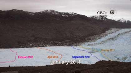 องค์กรเอกชน “เซนโทร ดี เอสทูดิโอส์” (ซีอีซี) แสดงภาพวีดิโอการลดน้อยถอยลงของธารน้ำแข็งจอร์จ มอนท์ ในพาทาโกเนีย ประเทศชิลี ในช่วงปีที่ผ่านมา พบว่าเส้นสีชมพูคือจุดของธารน้ำแข็งเมื่อกุมภาพันธ์ 2553 เส้นสีส้มคือจุดของธารน้ำแข็งเมื่อเมษายน 2553 เส้นสีน้ำเงิน เมื่อกันยายน 2553 และสีเหลืองเมื่อมกราคม 2554 นักวิทยาศาสตร์ชิลี อังเดรส์ ริเวรา หัวหน้าห้องปฏิบัติการธารน้ำแข็งของซีอีซี กล่าวว่า จากภาพแสดงให้เห็นว่าส่วนที่เป็นแหลมของธารน้ำแข็งนี้ลดลงไปประมาณ 1 กม. ระหว่างเดือนกุมภาพันธ์ 2553- มกราคม 2554.