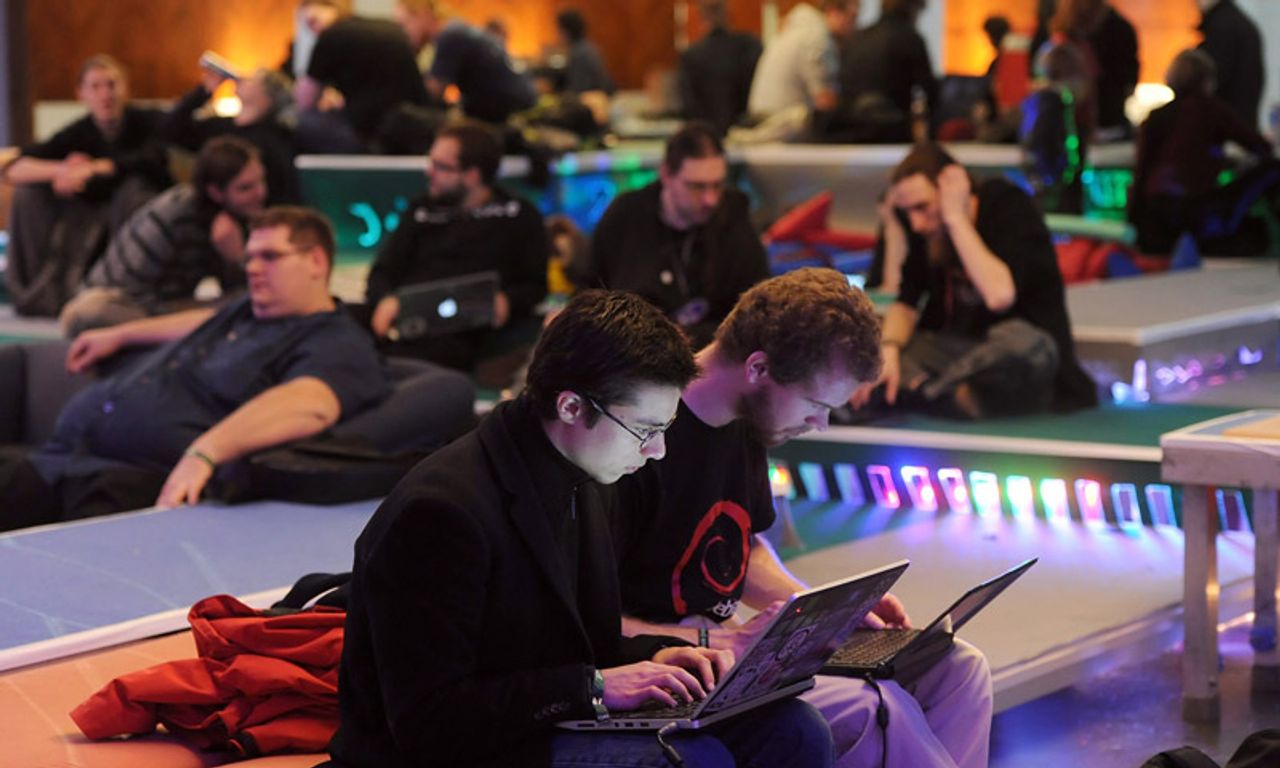 ผู้เข้าร่วมงานประชุมแคออส คอมพิวเตอร์ คลับ (ซีซีซี) ประจำปี ครั้งที่ 28 นั่งทำงานอยู่หน้าคอมพิวเตอร์แล็ปท็อป ซึ่งการประชุมครั้งนี้ดำเนินไปจนถึง 30 ธันวาคม 2554 มีเนื้อหาเกี่ยวกับความปลอดภัยด้านเทคโนโลยีสารสนเทศ และการป้องกันข้อมูล ที่ศูนย์ประชุมเบอร์ลิน (บีซีซี) ในกรุงเบอร์ลิน ประเทศเยอรมนี.