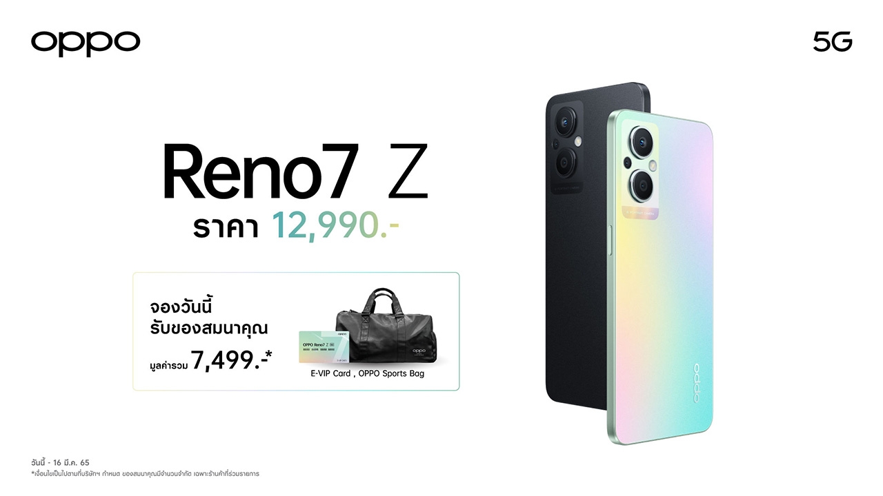 โดย OPPO Reno7 Z 5G ได้เปิดตัวอย่างเป็นทางการไปเมื่อวันที่ 3 มีนาคม พร้อมกับอุปกรณ์ IoT ที่จะมามอบประสบการณ์การใช้งานที่ก้าวไปอีกขั้นด้วย OPPO Enco Air2 หูฟังไร้สายตัวใหม่ล่าสุด โดดเด่นด้วยดีไซน์เคสโปร่งแสงเป็นเอกลักษณ์ ประสบการณ์เสียงที่ทรงพลังด้วย 13.4 mm composite tetanized diaphragm driver ไดรเวอร์ไดนามิกขนาดใหญ่ มอบเสียงเบสที่ทรงพลังและมีประสิทธิภาพยิ่งขึ้น ดื่มด่ำกับโลกแห่งเสียงดนตรีได้เต็มอรรถรส และยังใช้งานได้นาน ไร้กังวลด้วยแบตเตอรี่ยาวนาน 24 ชั่วโมงและอุปกรณ์ IoT สำหรับคนรักสุขภาพอย่าง OPPO Watch Free สมาร์ทวอตช์ระดับเริ่มต้น ที่มาพร้อมกับฟีเจอร์ OSleep ฟีเจอร์ที่เป็นตัวช่วยในการติดตามการนอนหลับแบบมืออาชีพ ด้วยการวัดค่า Sp02 แบบต่อเนื่องที่เหนือระดับมากยิ่งขึ้น ทำให้สามารถประเมินความเสี่ยงอาการนอนกรนแบบได้แบบมืออาชีพ ทั้งยังสามารถใช้งานได้นาน ชาร์จเพียง 5 นาทีก็ใช้งานได้ทั้งวันแล้ว และยังมาพร้อมดีไซน์สวยเก๋ แมตช์ได้กับทุกสไตล์ พร้อมเป็นคู่หูในชีวิตสมาร์ทไลฟ์ทุกสถานการณ์