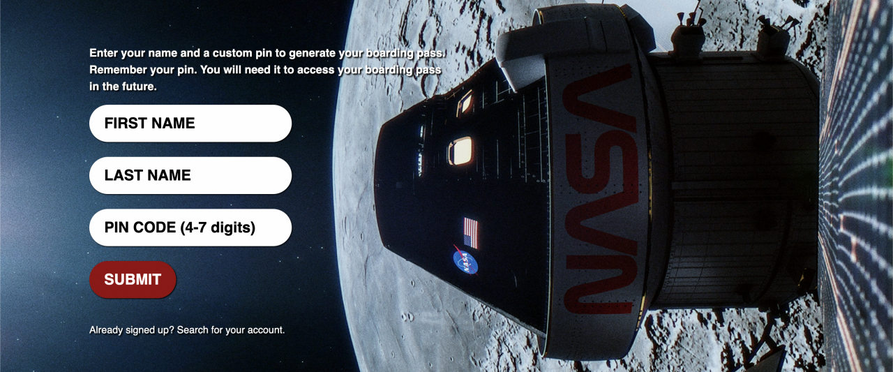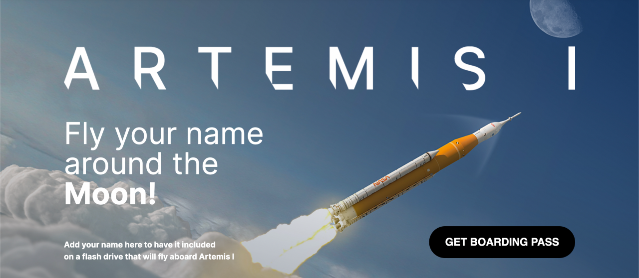 ในเวลาเดียวกัน นาซา ได้มีแคมเปญสนุกๆ เชื้อเชิญให้ผู้คนที่สนใจอยากร่วมเป็นส่วนหนึ่งของภารกิจ Artemis 1 เพียงส่งชื่อของตัวเองไปที่เว็บไซต์ https://www.nasa.gov/send-your-name-with-artemis/#user-information แล้วคลิกไปที่ “Get Boarding Pass”