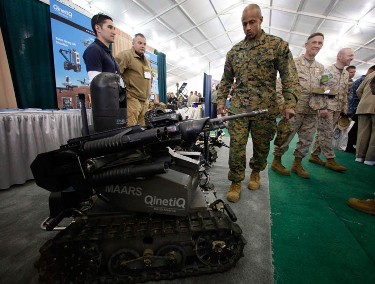 ทหารเดินดูหุ่นยนต์เอ็มเอเออาร์เอส (โมดูลาร์ แอดวานซ์ อาร์ม โรโบติค ซิสเต็ม) ที่นำมาจัดแสดงในงานมารีน เวสท์ มิลิทารี เอ็กซ์โป ที่รัฐแคลิฟอร์เนีย งานนี้จัดว่าเป็นเอ็กซ์โปด้านยุทโธปกรณ์สำหรับทหารที่ใหญ่ที่สุดงานหนึ่ง จัดเป็นประจำทุกปี.