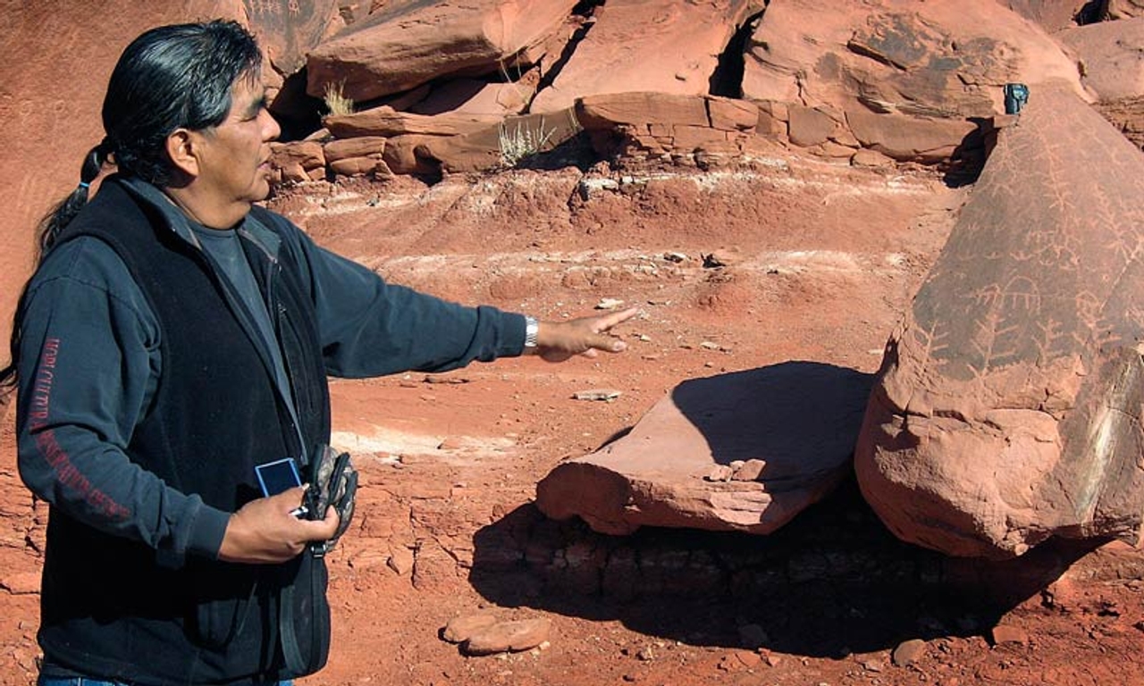 ลี เวย์น โลมาเยสเตวา ชี้ไปยังส่วนหนึ่งของการแกะสลักหินโบราณตูตูเวนิ ใกล้เมืองทูบา รัฐอริโซนา ซึ่ง ในบริเวณนี้มีชื่อว่า “ก้อนหินหนังสือพิมพ์” มีประมาณ 5,000 ก้อน เป็นสัญลักษณ์ของ ชนเผ่าโฮปิ นับเป็นคอลเลกชั่น ขนาดใหญ่ที่สุดเท่าที่ค้นพบมาในภาคตะวันตกเฉียงใต้ของอเมริกา และถูกคุกคามโดยพวกลักขโมยจนนักวิจัยและนักโบราณคดีต้องช่วยกันทำรั้วป้องกันและติดตั้งกล้องตรวจจับความเคลื่อนไหว เพื่ออนุรักษ์ทรัพยากรทางวัฒนธรรมที่สำคัญนี้ไว้.