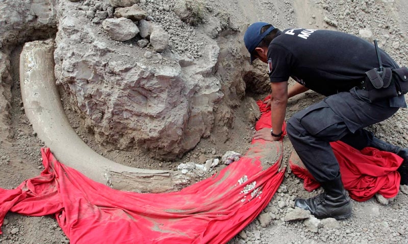 ตำรวจในเม็กซิโกนำผ้ามาคลุมวัตถุที่น่าเชื่อว่าจะเป็นงาของช้างแมมมอธ พบเมื่อหลายวันก่อนที่เมืองชิกนาฮัวพัน เทศบาลเมืองชิกนาฮัวพันได้ล้อมบริเวณดังกล่าว เป็นการเฝ้าระวังระหว่างรอเจ้าหน้าที่ผู้เชี่ยวชาญจากสถาบันมานุษยวิทยาและประวัติศาสตร์แห่งชาติ (INAH) มาตรวจสอบ.