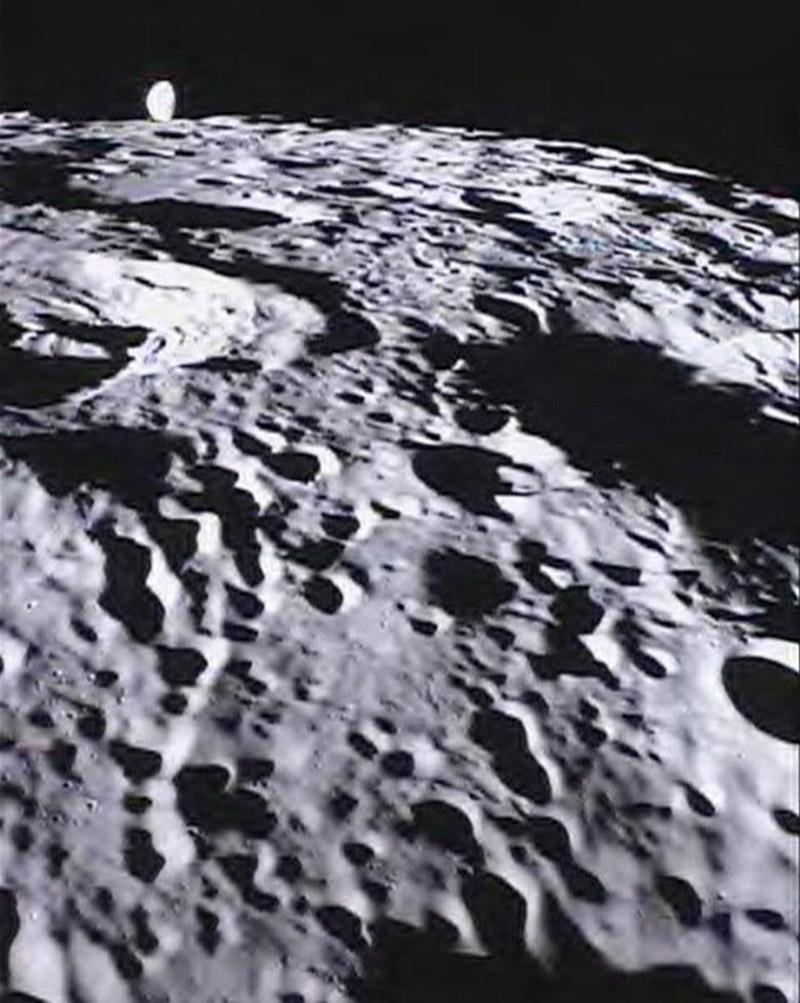 ภาพถ่ายของยานอวกาศ “เอบบ์” แสดงสภาพผิวพื้นด้านหลังของดวงจันทร์ เห็นหลุมยักษ์ “เดอ ฟอร์เรสท์” ตั้งอยู่ค่อนไปทางข้างซ้าย ทำให้ถูกแสงแดดมองเห็นเป็นบริเวณสว่าง.