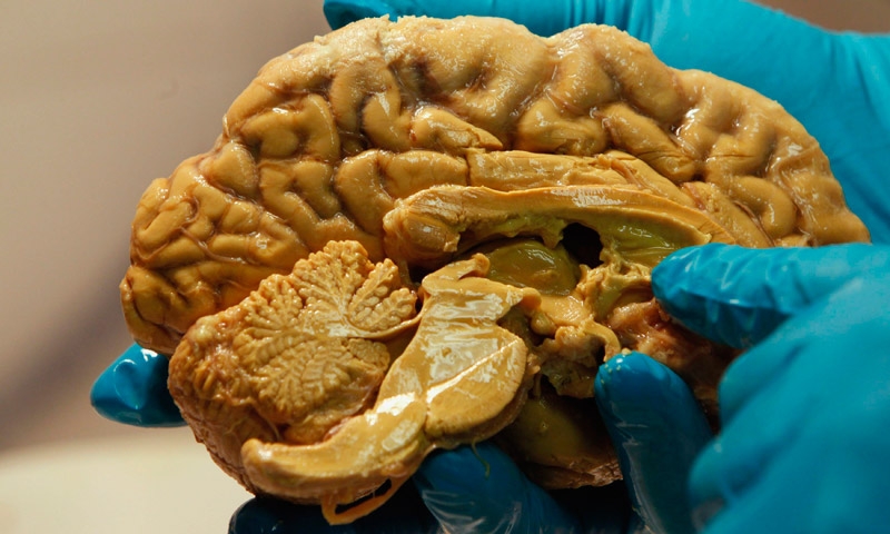 นักวิทยาศาสตร์ฮังการี ถือมันสมองของมนุษย์ มองเห็นบริเวณที่ถูกพิษจากการกินยาบางชนิดอยู่เป็นเวลานาน โดยบางส่วนได้ยุบเข้าไป.