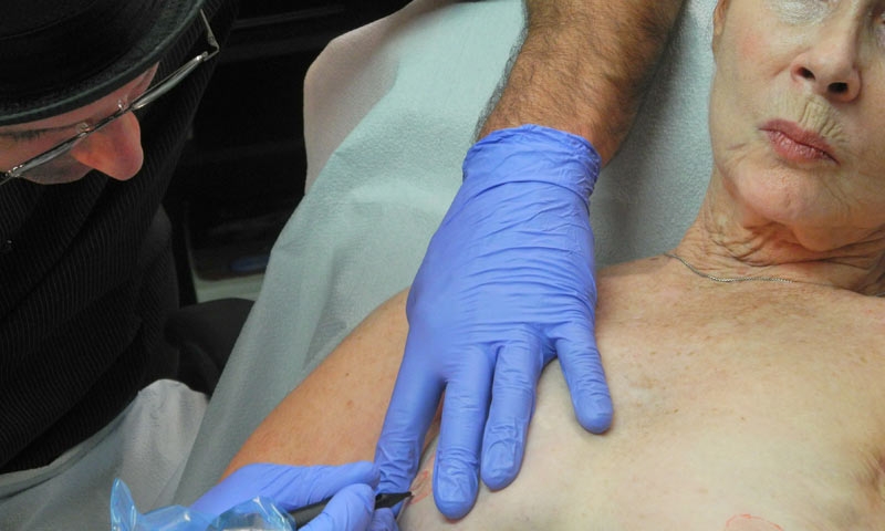 ช่างสักในรัฐแมรีแลนด์ ของสหรัฐฯ บรรจงสักรูปหัวนมและวงดำรอบหัวนม ให้กับหญิงสูงอายุวัย 72 ปี ซึ่งโดนผ่าตัดเอาเต้านมออก ช่างต้องผสมสีหมึกอย่างพิถีพิถัน เพื่อให้สีกลมกลืนกับผิวเนื้อ โดยเฉลี่ยการสักต้องใช้เวลา 2 ชม.