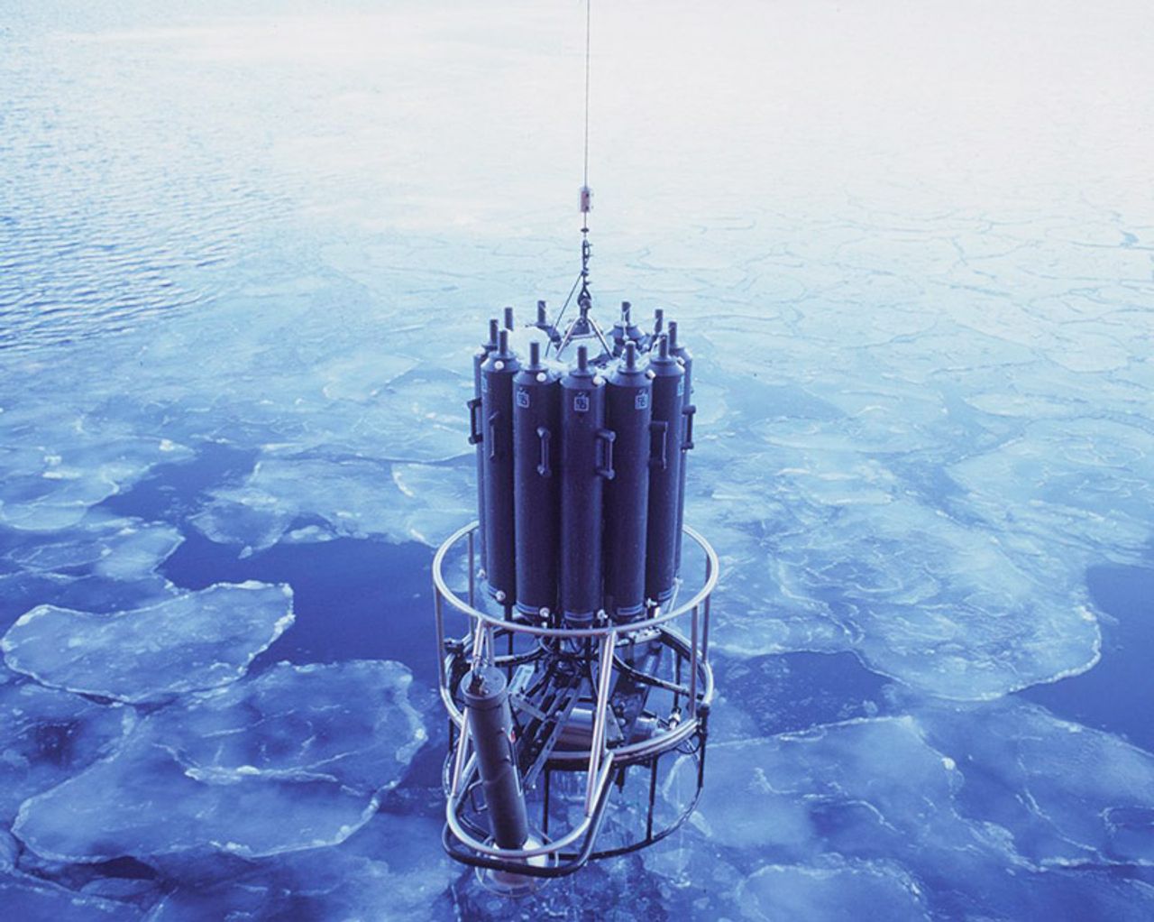 นักวิทยาศาสตร์หยั่งเครื่อง มือซึ่งมีความไวสูง ลอดช่องน้ำแข็งลงในมหาสมุทร ในเขตแอนตาร์กติกา เพื่อเก็บตัวอย่างน้ำในระดับความลึกต่างๆ ตั้งแต่ผิวน้ำจนถึงก้นสมุทร.
