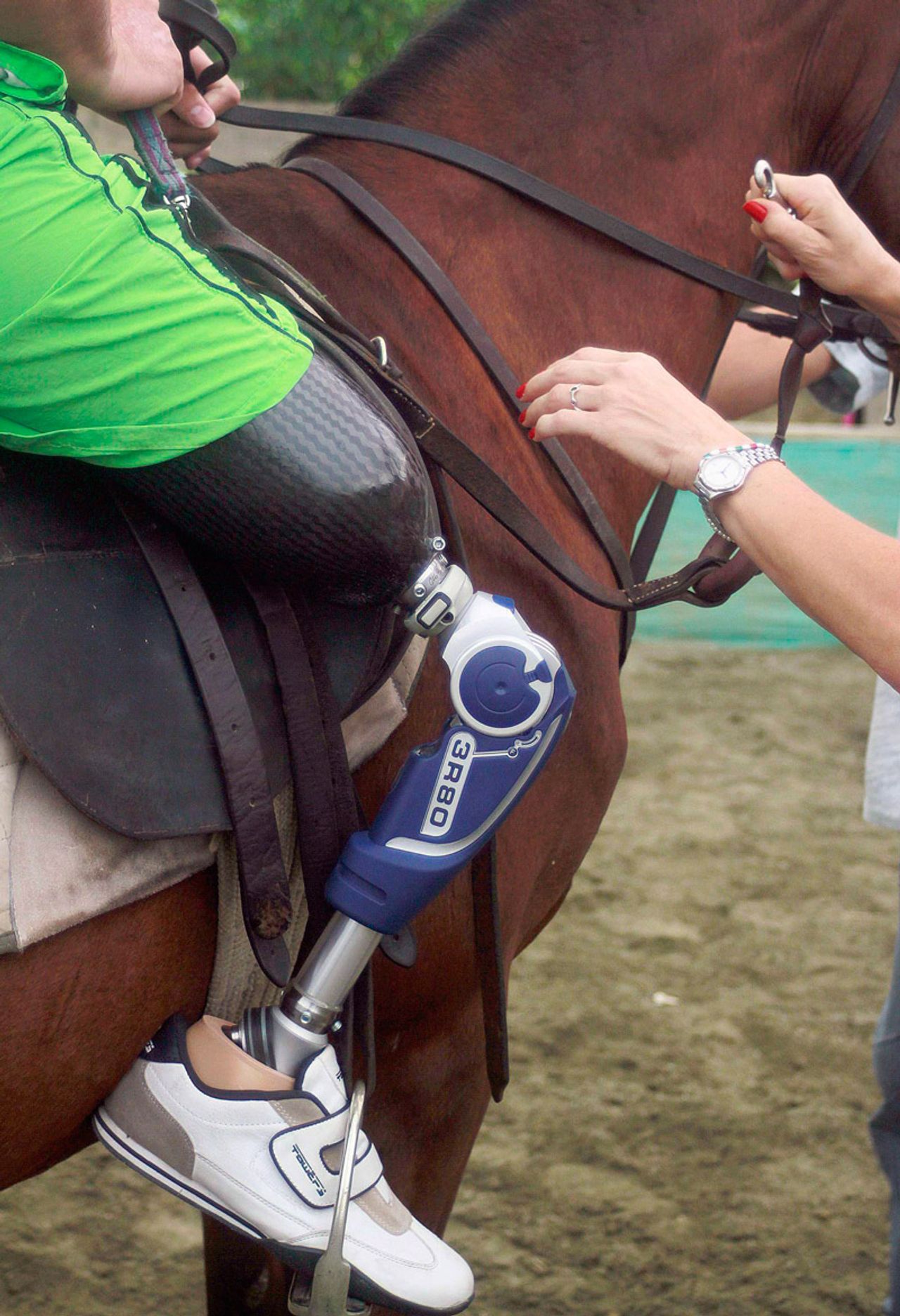 ทหารผ่านศึกโคลอมเบียผู้หนึ่ง ซึ่งพิการจากการโดนกับระเบิด ฝึกซ้อมขี่ม้า อันเป็นวิธีการบำบัดรักษาอย่างหนึ่ง.