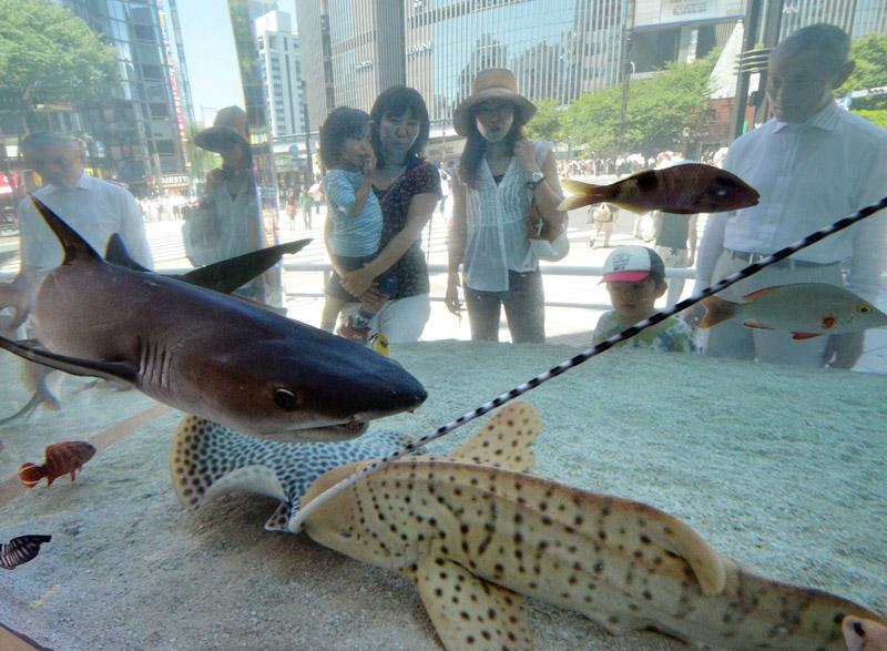 บริษัทโซนี่ที่ย่านกินซ่า ในกรุงโตเกียว ได้แปลงตู้โชว์ เป็นตู้ปลายักษ์ มีทั้งปลาฉลาม และปลาเมืองร้อนชนิดต่างๆที่หาได้จากทะเลรอบเกาะโอกินาวา ทางปลายใต้ของเกาะญี่ปุ่น.