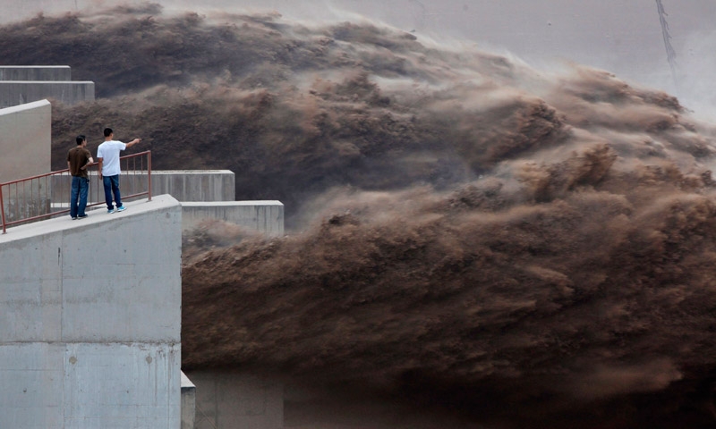 ชาวจีนท้องถิ่นพากันมาดูปริมาณน้ำที่ข้นดำด้วยตะกอน หน้าเขื่อน กั้นแม่น้ำเหลืองที่เมืองเหลียวหยางอันน่าหวั่นหวาด เมื่อปลายเดือนที่แล้ว.