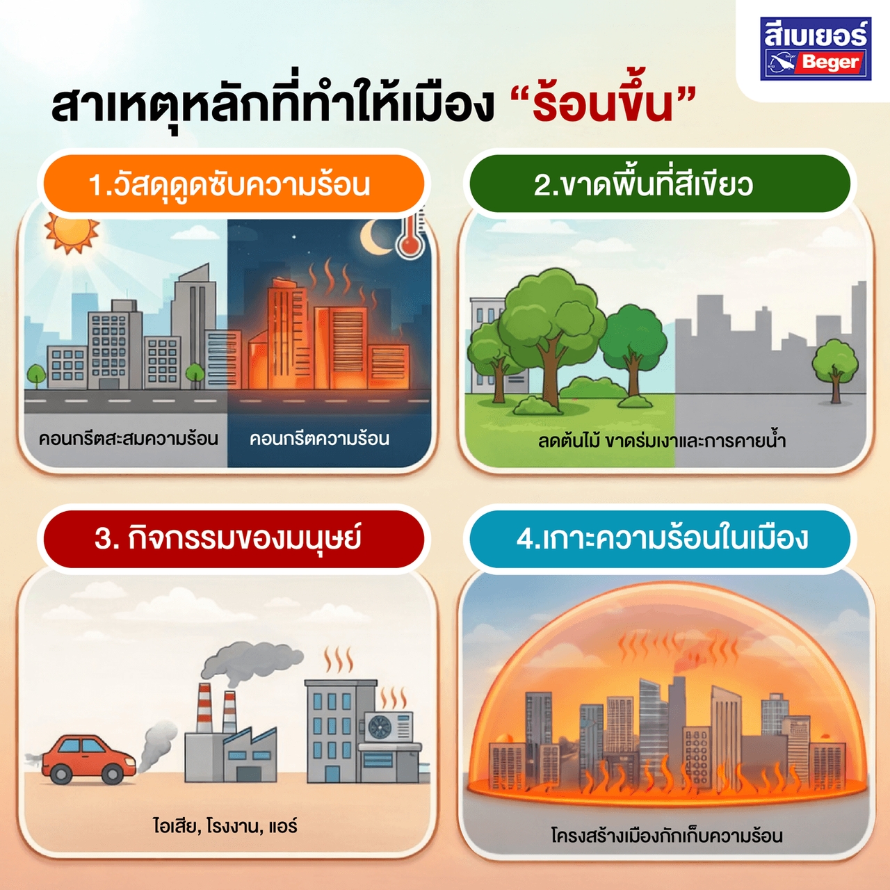 ความร้อนที่เราเผชิญทุกวันนี้ ไม่ได้มาจากแสงแดดเพียงอย่างเดียว แต่ยังเกิดจากหลายปัจจัย โดยเฉพาะปรากฏการณ์ Urban Heat Island หรือ “เกาะความร้อนในเมือง” ที่เกิดจากการสะสมความร้อนของผนัง หลังคา ถนน และอาคารโดยรอบ