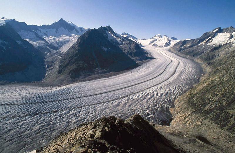 มหาวิทยาลัยซูริกของสวิตฯ ถ่ายภาพบริเวณช่องเขาอเลต อัน เป็นแหล่งแม่น้ำน้ำแข็ง ใหญ่ที่สุดของทิวเขาแอลป์ แต่ปัจจุบันปริมาณน้ำแข็งได้ละลายเหลือน้อยลง โดยเฉพาะตามแถวขอบ ไปจนถึงริมขวาของภาพ มันได้เริ่มบางลงมาตั้งแต่ตอนกลางศตวรรษที่ 19 เป็นต้นมา.