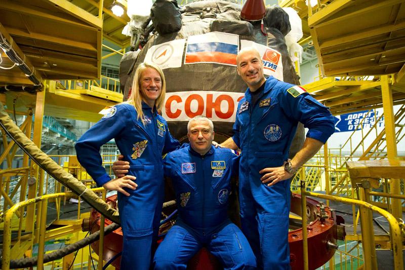 มนุษย์อวกาศสหภาพยุโรป ลูตา ปาร์มิทาโน มนุษย์อวกาศองค์การอวกาศสหรัฐฯ กาเรน ไนเบิร์ก และมนุษย์อวกาศรัสเซียไฟโอดอร์ ยุคชิคฮิน รวมหมู่กันถ่ายรูปหน้ายานอวกาศ “โซยูซ” ก่อนหน้าจะออกเดินทางขึ้นไปประจำอยู่บนสถานีอวกาศระหว่างประเทศ ในวันที่ 29 พฤษภาคมนี้.