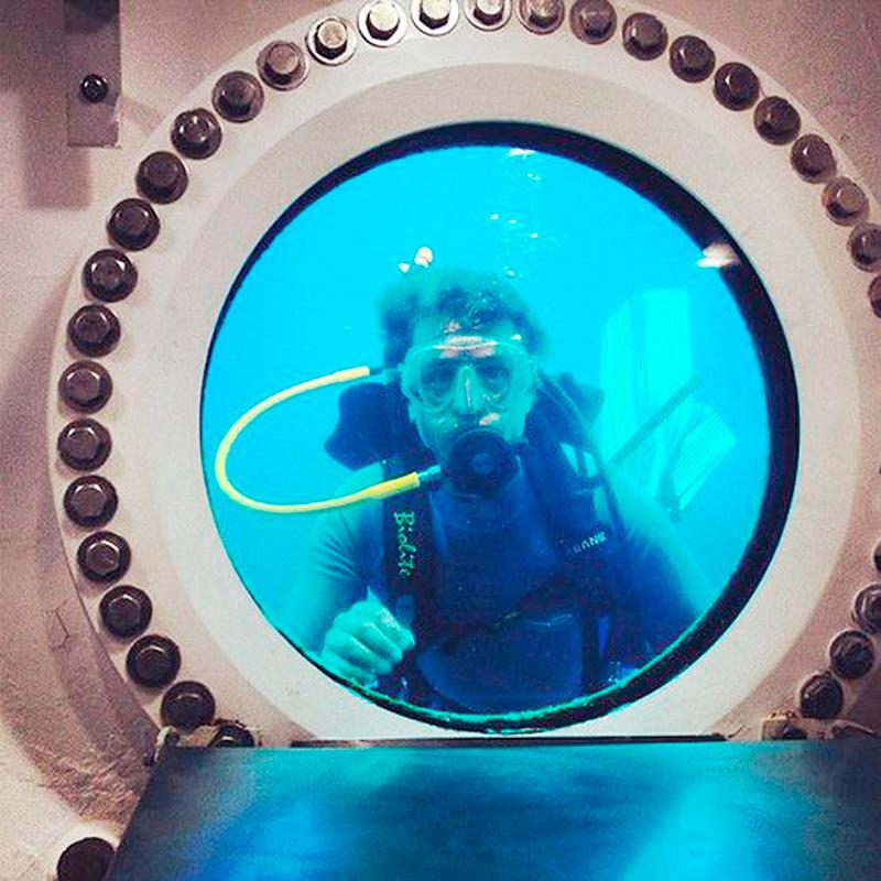 นายเฟเบียน คอสตู หลานของแจ๊ค คอสตู นักสมุทรศาสตร์ผู้มีชื่อเสียงชาวฝรั่งเศส มองลอดกระจกหัวยานสำรวจและห้องปฏิบัติ การทดลองใต้น้ำ “อคัวเรียส” ที่สถานพิทักษ์สัตว์น้ำแห่งชาติ ใกล้เมืองคีย์ ลาโก รัฐฟลอริดา เขาตั้งใจจะดำลงไปอยู่และปฏิบัติงานใต้น้ำลึก ทำสถิตินาน 31 วัน ภายในเร็ววันนี้.