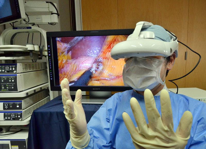 พนักงานบริษัท โซนี่แสดงกล้องส่องตรวจในตัว แบบใหม่ มีจอตั้งบนศีรษะเหมือนกับหมวกในตัว พร้อมส่วนประกอบอื่นๆ แสดงภาพได้ทั้ง 2 มิติและ 3 มิติบนจอ จะออกสู่ตลาดในเดือนหน้านี้.