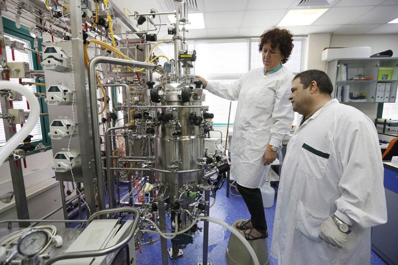 พนักงานคุมเครื่องผลิตวัคซีน ป้องกัน โรคไวรัสตับอักเสบบี ของห้องปฏิบัติการ ไว ไซส์ แวคส์ ที่ภาคกลางอิสราเอล กำลัง ปฏิบัติงาน ทางบริษัทกำลังขออนุมัติเพื่อเปิดตลาดในอเมริกา.