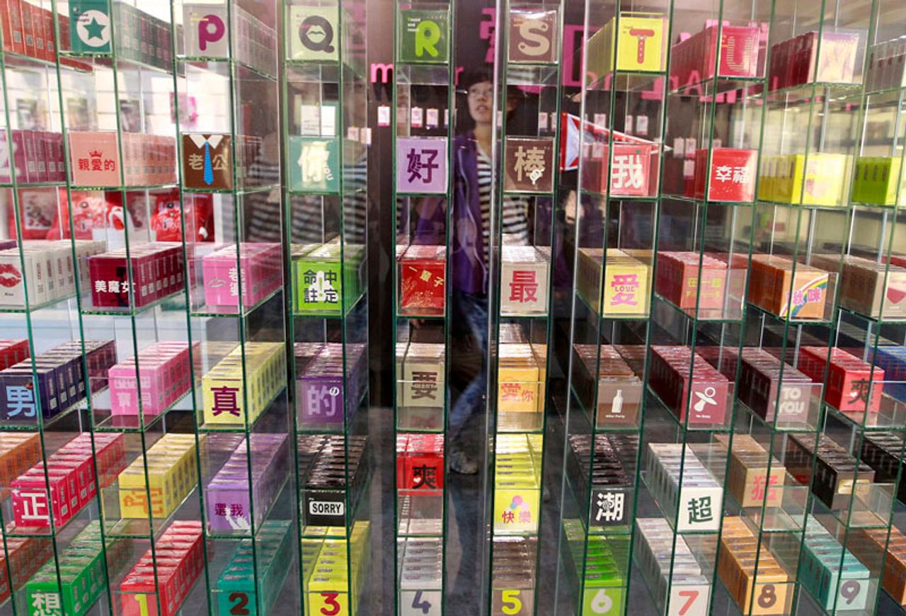แผงจำหน่ายถุงยางอนามัยชนิดต่างๆ ของศูนย์การค้นคว้าถุงยางอนามัย ลาเท็กซ์ ฟูจิของไต้หวัน ตั้งเปิดขายขึ้นในกรุงไทเป ทางศูนย์อ้างว่าเพื่อเป็นการเผยแพร่ความรู้ในเรื่องถุงยางอนามัยและการคุมกำเนิด.