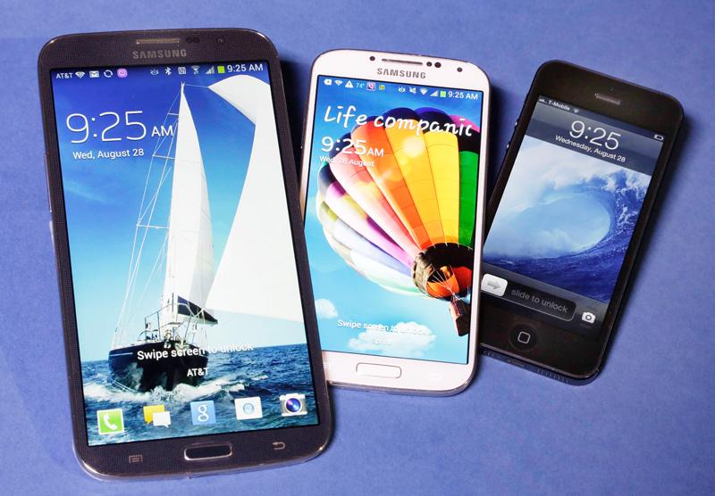 โทรศัพท์มือถือซัมซุง กาแล็คซี่ เมก้า (ซ้าย) ต่อท้ายด้วย ซัมซุง กาแล็คซี่ เอส 4 ตามด้วยแอปเปิล ไอโฟน 5 ออกมาประชันโฉม ที่กรุงนิวยอร์ก โดยมีโทรศัพท์กาแล็คซี่ี่ เมก้าจอใหญ่ถึง 7 นิ้ว ขนาดเกือบเท่ากับคอมพิวเตอร์ แท็บเล็ต.