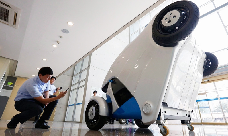 ผู้ชมถ่ายภาพรถยนต์ไฟฟ้าพับได้ รุ่น “ตัวนิ่ม” ที่สถาบันวิทยาศาสตร์และเทคโนโลยีก้าวหน้าเกาหลีใต้ ในเมืองแดจอน รถยนต์ซึ่งอยู่ในขั้นการทดลองบังคับด้วยโทรศัพท์มือถือ ให้มันเข้าที่จอดได้เอง โดยหดตัวเหลือขนาดเพียงครึ่งคัน เข้าจอดในที่แคบๆ ได้อย่างสบาย.