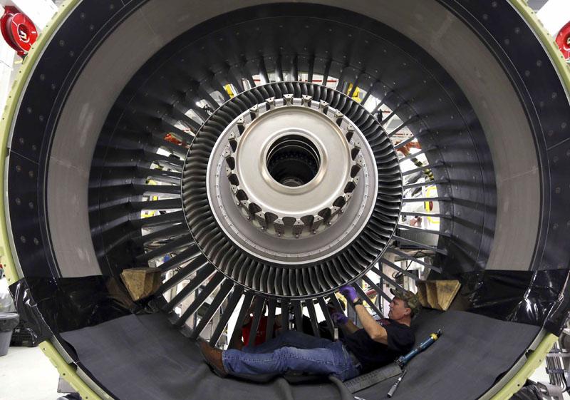 วิศวกรของโรงงานสร้างเครื่องบินบริษัทเยเนอรัล อีเลคตริกของอเมริกา กำลังเร่งมือ ประกอบ เครื่องยนต์แบบ GE90 ที่ศูนย์ปฏิบัติ การทดสอบของ บริษัท เมืองพีเบิลส์เนื่องจากได้รับใบสั่ง ซื้อ เครื่องบินไอพ่นโดยสารเพิ่ม จนสร้าง แทบไม่ทัน.