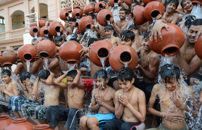 เด็กนักเรียนศาสนาฮินดู จากสวา มีนารายัน กุรูกุล เข้าร่วมในพิธีอาบน้ำ “มหาสนาน” ที่เมืองอาเหมดาบัด แม้ว่าที่โรงเรียนจะมีน้ำร้อนอาบกันอยู่แล้ว แต่พวกเขาก็ยินดีมาเข้าร่วมพิธีการอาบน้ำเย็น นานเป็นเวลา 1 เดือน ส่วนหนึ่งเพื่อให้ร่างกายคุ้นกับอากาศ และเพื่อผลดีกับสุขภาพด้วย.