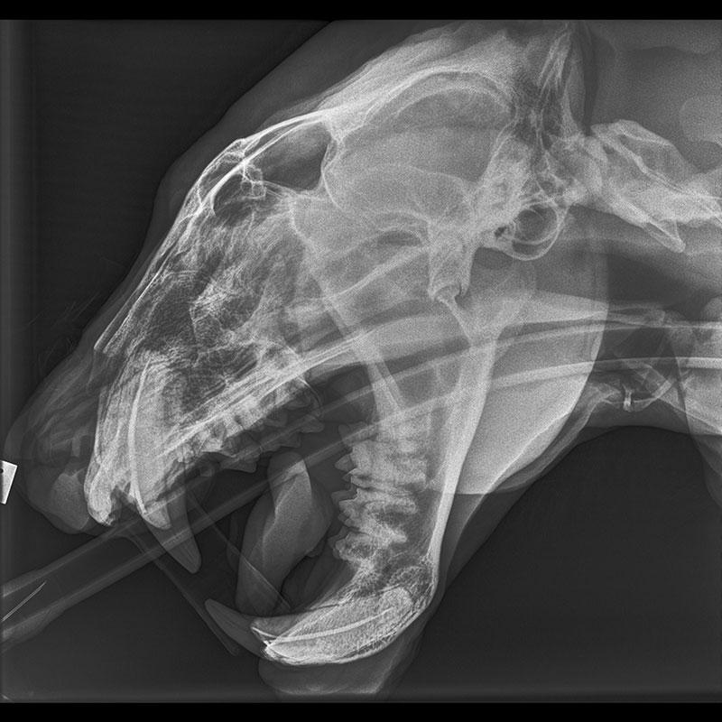 ภาพเอกซเรย์กะโหลกศีรษะของเจ้า “โรกัน” เสือตัวผู้หนัก 120 กก. ดาราของสวนสัตว์เวลลิงตัน กว่าจะจับมันถ่ายเอกซเรย์ได้ ต้องวางยาให้มันสลบเสียก่อน หลังจากที่พนักงานรู้สึกว่าเสือหนุ่มอายุ 17 ปี ดูท่าว่าไม่ค่อยสบาย.