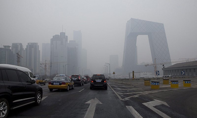 รถราติดกันนุงนังในย่านธุรกิจกลางของกรุงปักกิ่ง เนื่องจากหมอกลงจัด ทางการป้องกันมลพิษในอากาศต้องออกคำสั่งห้ามการปิ้งย่างอาหาร การจุดดอกไม้ไฟ และงานรื้อถอนสิ่งก่อสร้างเมื่อตอนกลางเดือนนี้ ดีแต่ว่ายังไม่ร้ายแรง ถึงกับต้องห้ามรถยนต์ตั้งครึ่งเมืองออกมาวิ่งเท่านั้น.