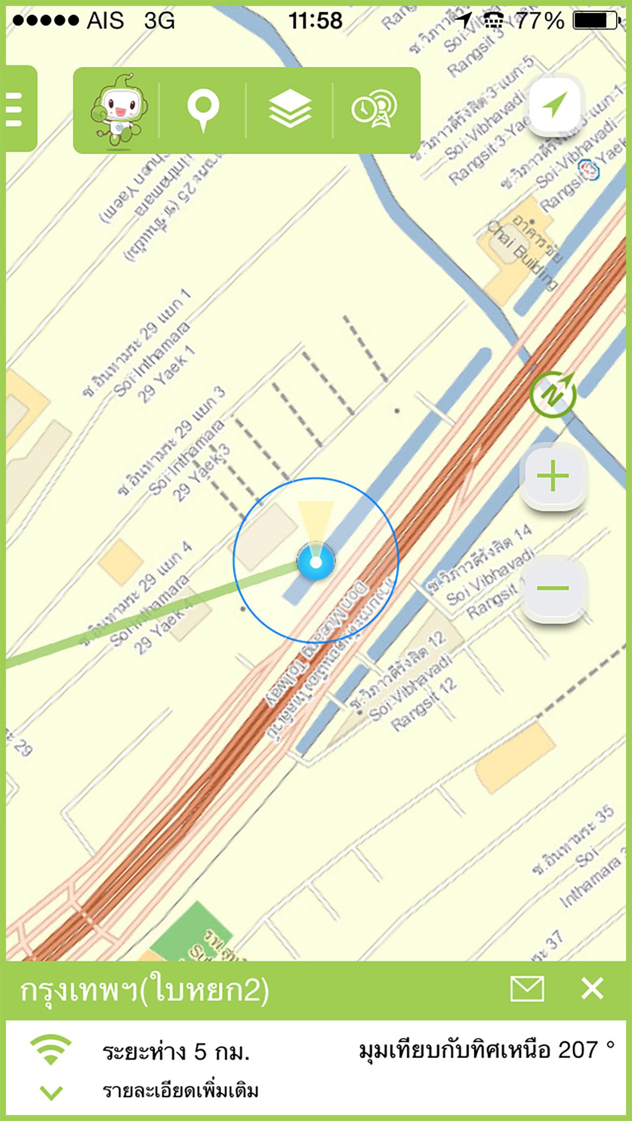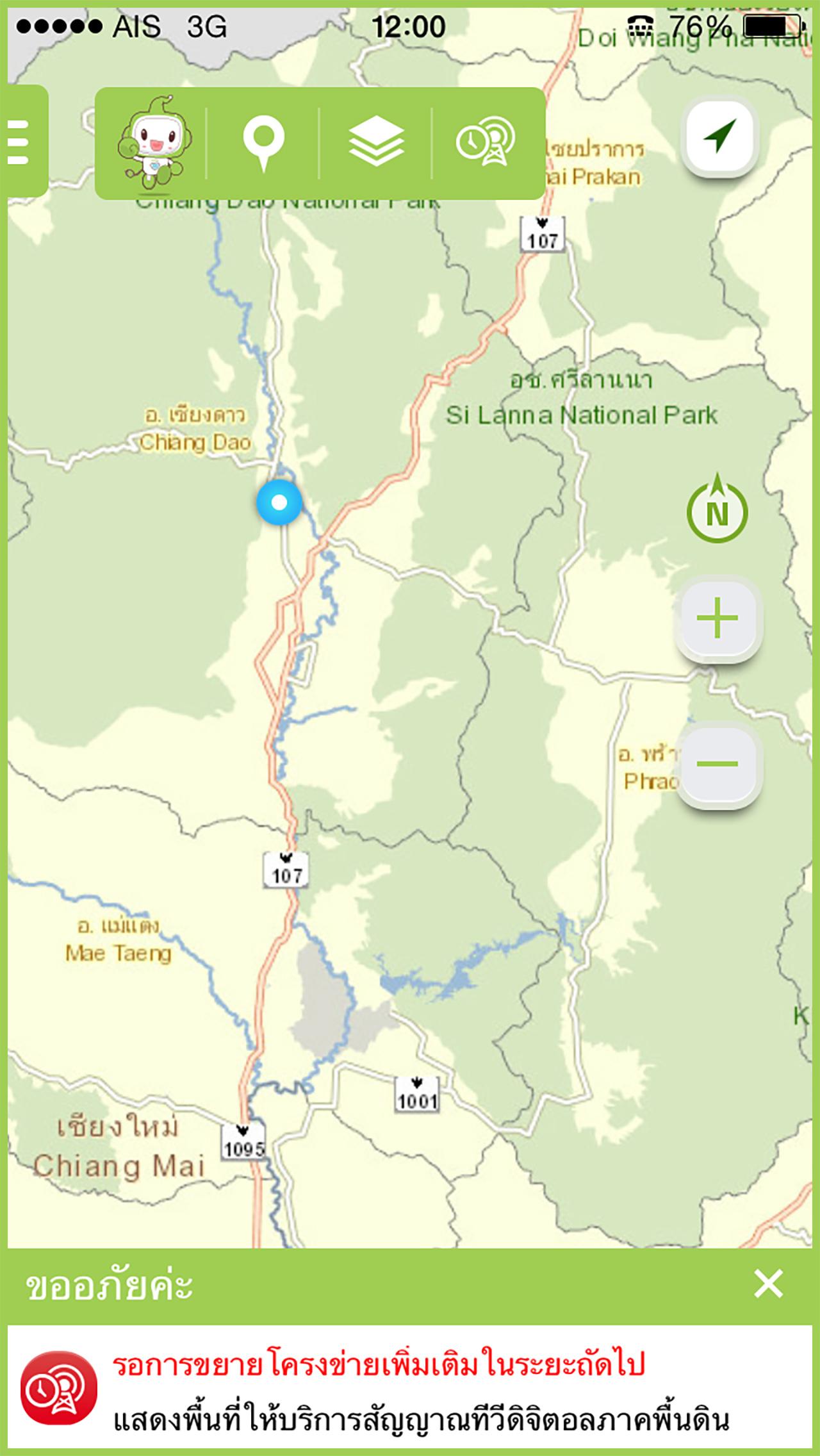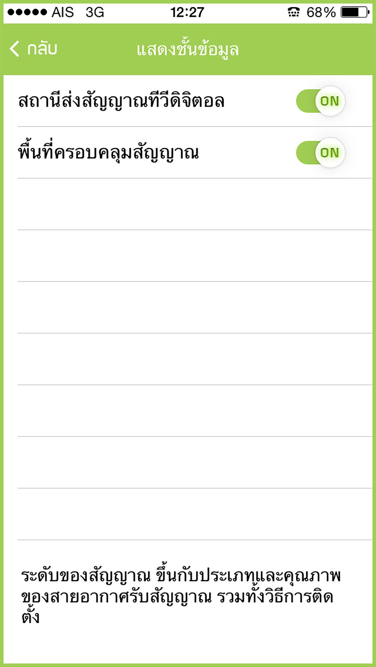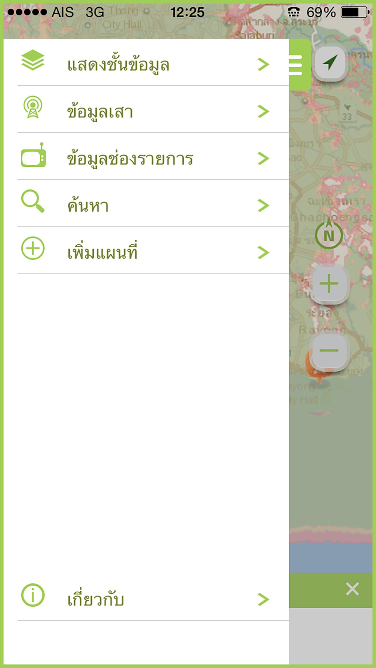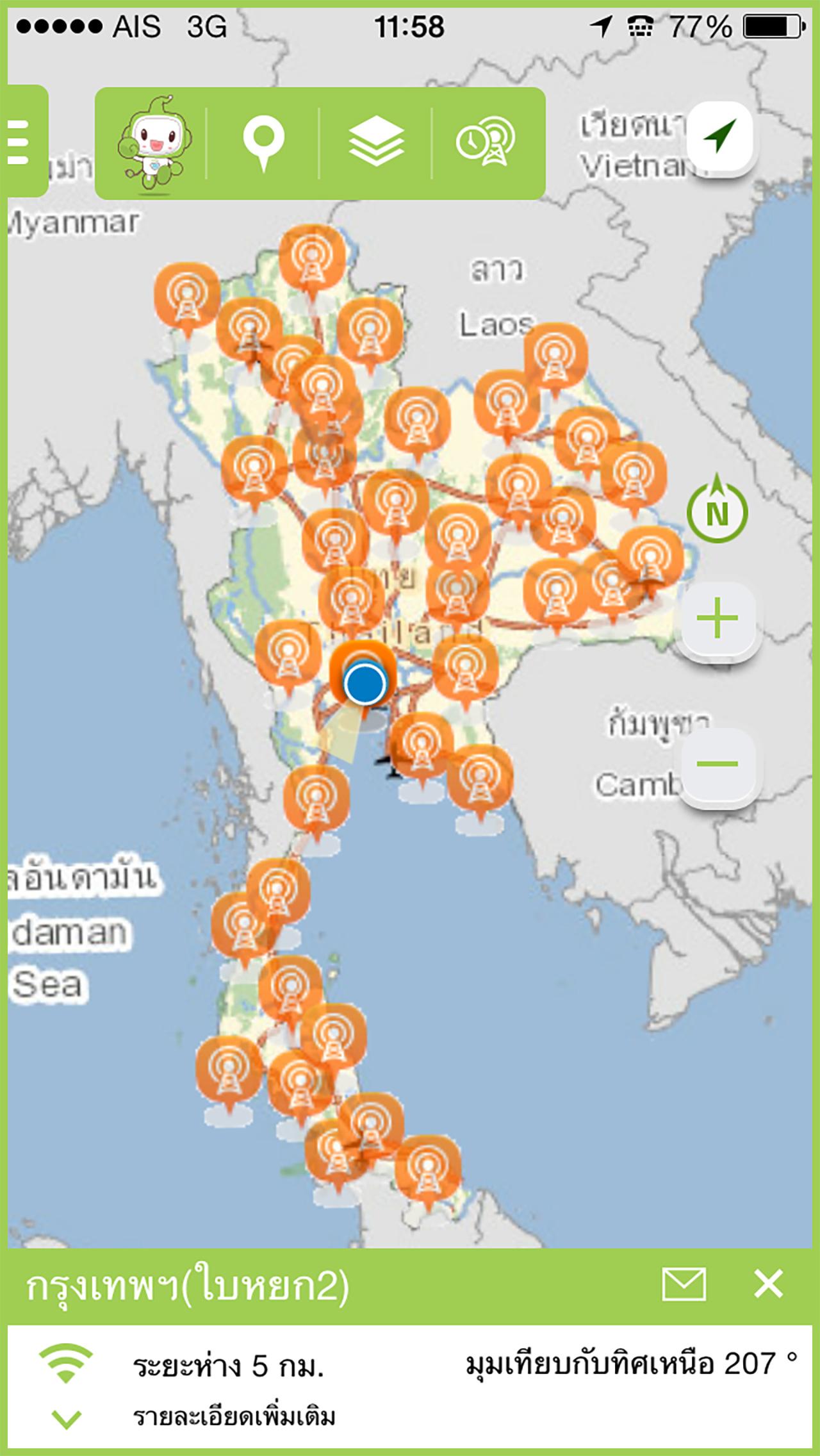 • แสดงชั้นข้อมูล ตัวนี้สามารถเลือกเปิดดูได้ ว่าจะให้แผนที่เห็นภาพเสาส่งสัญญาณทั้งหมด และพื้นที่ครอบคลุมสัญญาณของแต่ละเสา