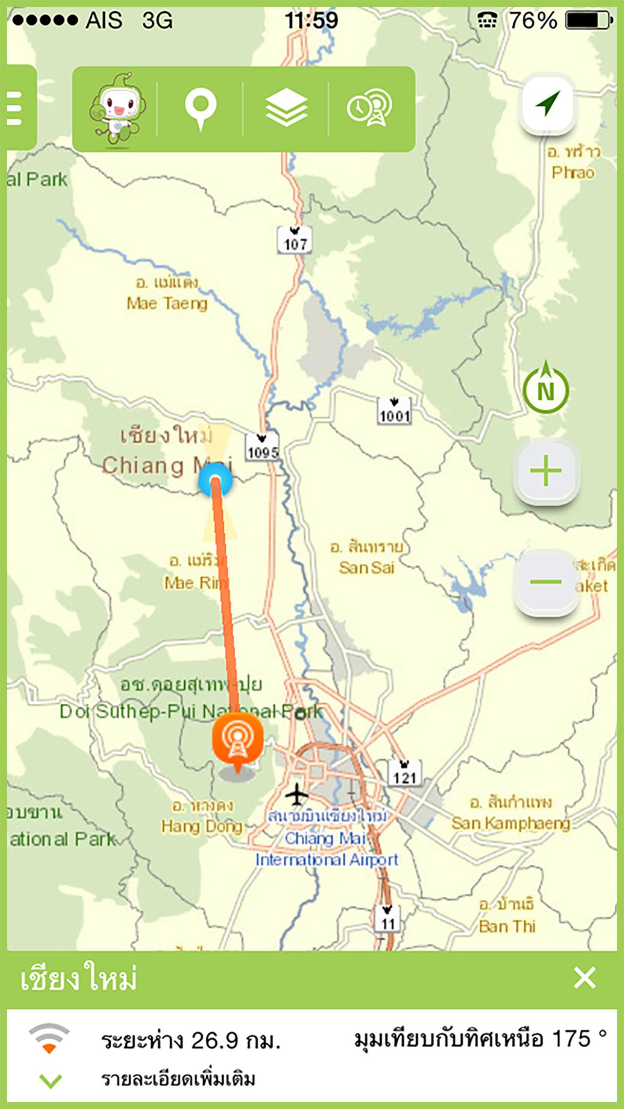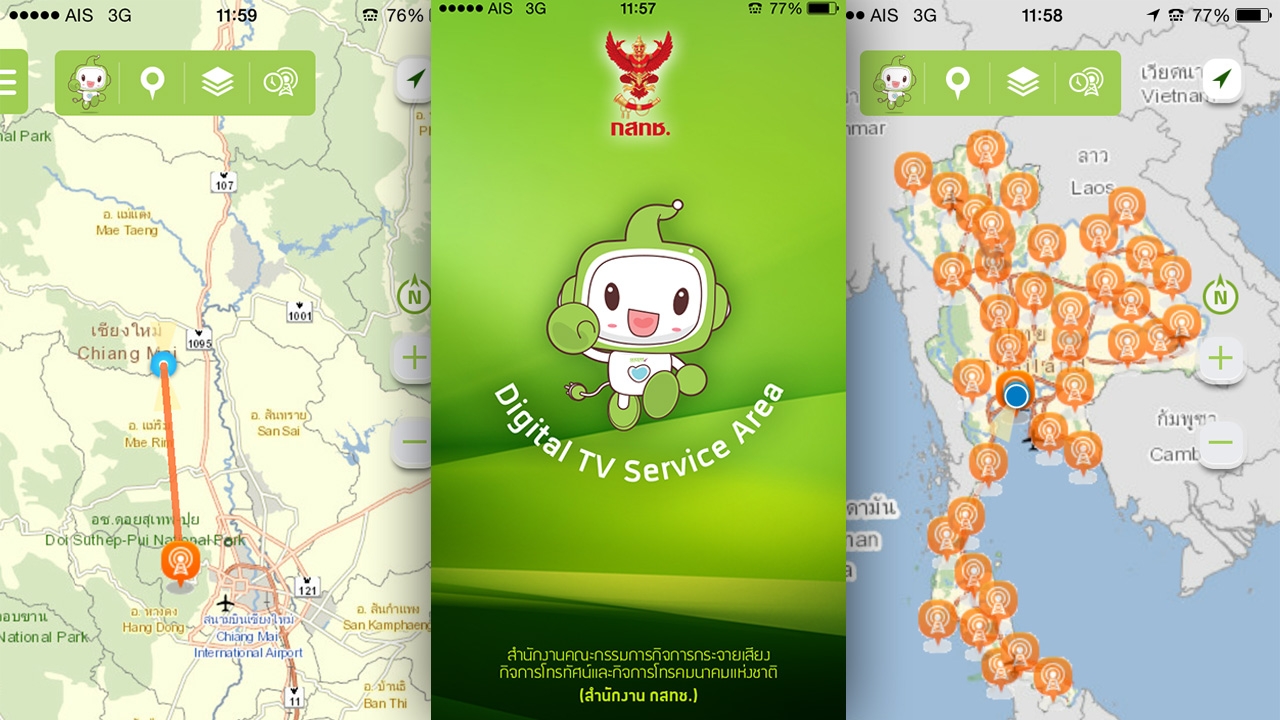 หลังจากนั้นแอพฯ จะระบุจุดที่เราอยู่ว่าที่ไหน ห่างจาก MUX หรือเสาส่งสัญญาณทีวีดิจิตอลที่ใกล้ที่สุดมากน้อยแค่ไหน เพราะถ้าหากเราอยู่ในระยะสัญญาณที่รับได้ ก็จะมีเส้นสีเขียวเชื่อมระหว่างพิกัดของเรากับเสาส่งสัญญาณ แปลว่าเราดูทีวีดิจิตอลได้ชัดแจ๋ว แต่ถ้าเส้นดังกล่าวกลายเป็นสีส้มสัญญาณก็จะบางลงหน่อย