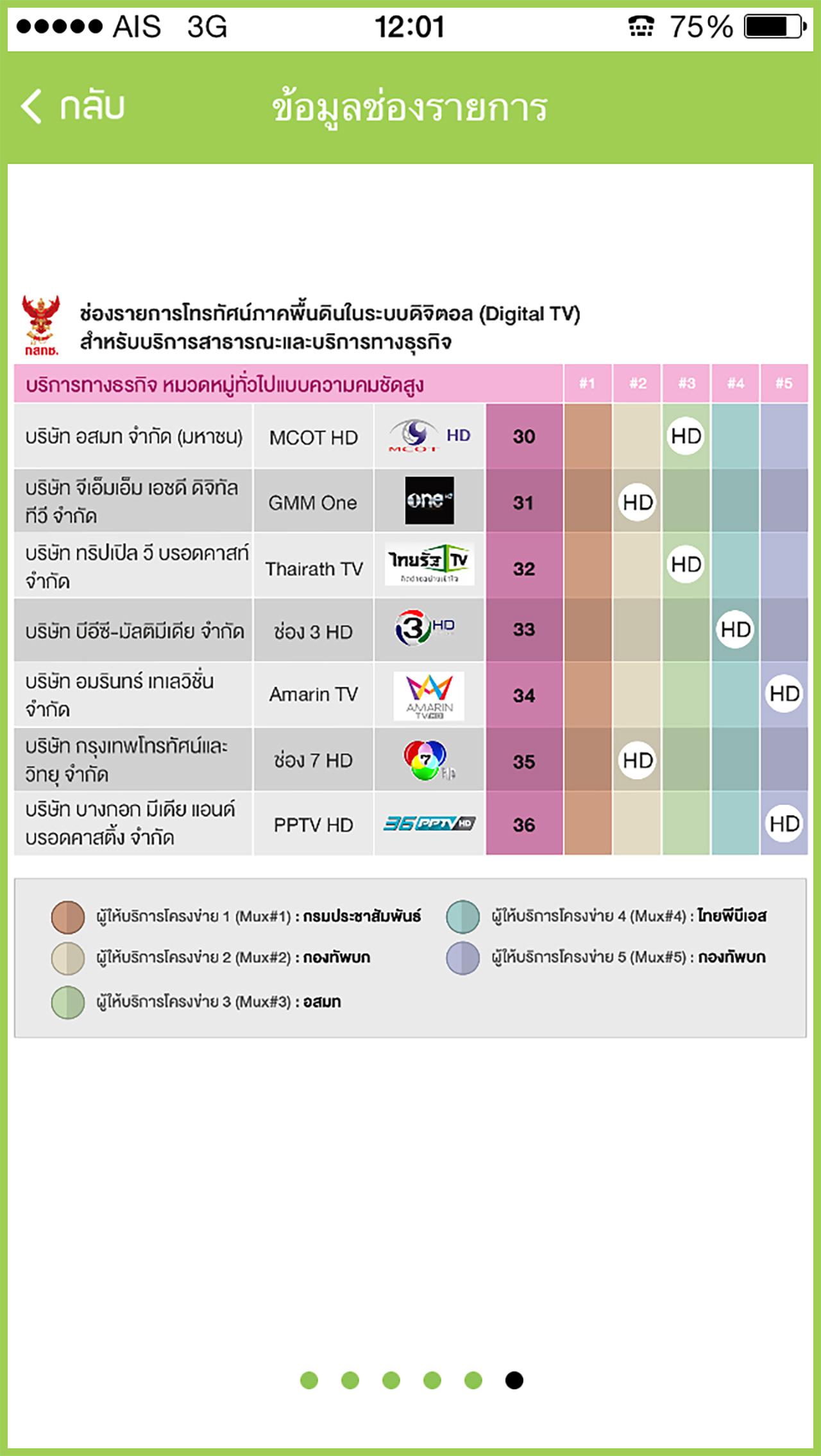• ข้อมูลช่องรายการ แสดงรายละเอียดช่องทีวีดิจิตอลทั้ง 48 ช่อง ระบุ ชื่อช่อง เลขช่อง ประเภทรายการ และเสาส่งสัญญาณ